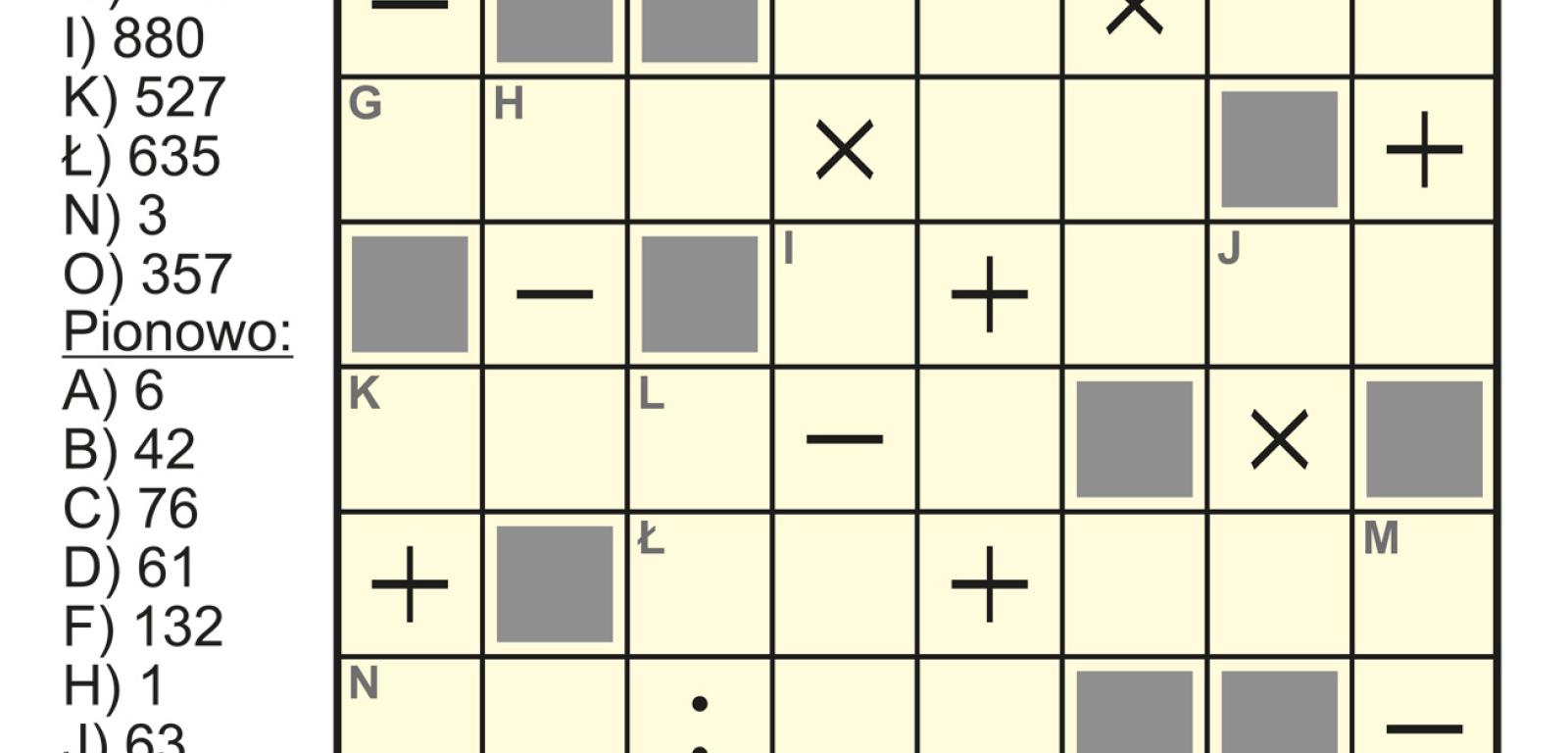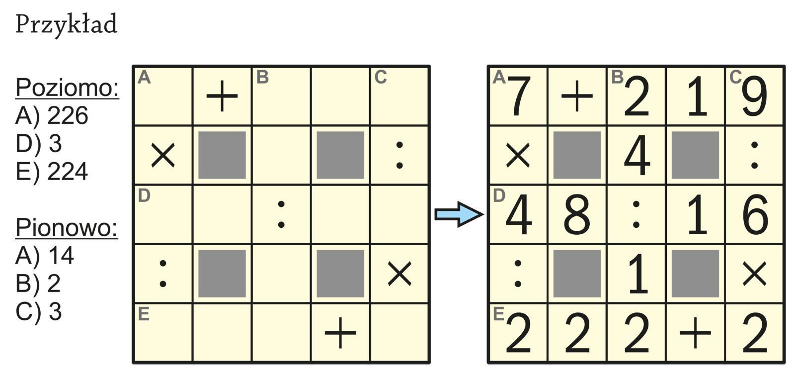 W rzędach pól, do których w zwykłej krzyżówce wpisuje się słowa, powinny pojawić się działania. Znaki działań są już na swoich miejscach, więc w puste kratki należy wpisać cyfry – takie, aby powstałe liczby tworzyły działania, których wyniki podane są jako „objaśnienia”.