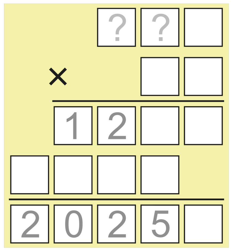 Kluczem do jej ustalenia jest mnożenie szkieletowe, w którym ujawniono rok i miesiąc, a para znaków zapytania zastępuje zagadkowy dzień. Pozostałe cyfry występujące w zapisie działania zastąpiono pustymi kratkami.