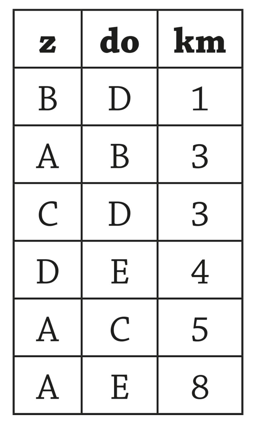Domy A, B, C, D i E połączone są prostymi drogami. Przy tej samej prostej drodze mogą znajdować się więcej niż dwa domy. W tabelce podane są odległości między domami.