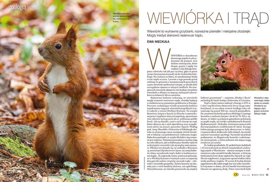 Chciałabym zwrócić uwagę na błąd, który pojawił się w nr. 1095 „Wiedzy i Życia”. W artykule „Wiewiórka i trąd” pod fotografią na str. 65 czytamy, że to wiewiórka pospolita. Na zdjęciu widać jednak nie przedstawicielkę Sciurus vulgaris, ale gatunku Tamiasciurus hudsonicus, potocznie nazywaną wiewiórką Hudsona albo sosnowiórką czerwoną. Ta pomyłka zwróciła moją uwagę, ponieważ sama mam wiewiórkę hodowlaną tego gatunku. Jako wierna czytelniczka „Wiedzy i Życia” pozwoliłam sobie na tę uwagę.