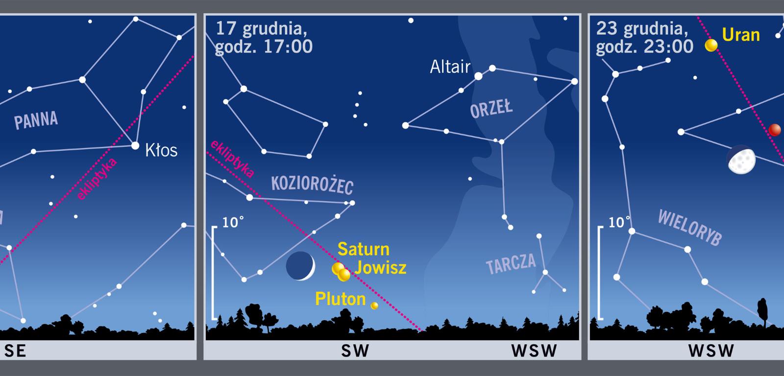 Już 12 grudnia nad ranem zobaczymy cieniutki sierp Księżyca koło Wenus w Wadze. 17 grudnia wieczorem nasz satelita odwiedzi Jowisza w Strzelcu i Saturna w Koziorożcu. 23 grudnia Srebrny Glob spotka się z Marsem w konstelacji Ryb.