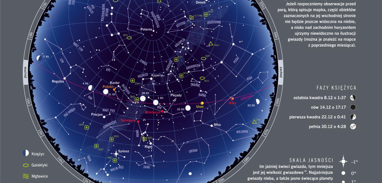 Grudzień oznacza początek astronomicznej zimy. W tym roku powitamy ją 21 grudnia o 11:02. Nadejście najzimniejszej pory roku obwieści nam wyjątkowo krótki dzień: 21 grudnia potrwa tylko od 7:43 do 15:25. Tego dnia w południe słońce wzniesie się na wysokość zaledwie 14,3° nad płaszczyznę horyzontu. Wcześnie zapadająca noc ma jedną zaletę: oczekujący na wigilijną pierwszą gwiazdkę nie będą musieli długo jej wypatrywać. W tym roku takich gwiazdek będzie zresztą całkiem sporo. Często przecież jasny punkt widoczny tuż po zapadnięciu zmroku to nie tyle prawdziwa gwiazda, ile udająca ją planeta. Spoglądając ok. 16:00 na ciemniejące niebo, możemy jeszcze poszukać zachodzących tuż obok siebie Jowisza i Saturna. Jeśli nasze okna wychodzą na wschód – gwiazdką może zostać czerwonawy Mars. Nie zawiodą nas też jednak i prawdziwe gwiazdy. Obróćmy się dookoła: na wschodnim niebie możemy poszukać Aldebarana, a nisko nad południowym horyzontem dostrzeżemy alfę Ryby Południowej, jasną Fomalhaut. Wysoko po zachodniej stronie nieba będziemy podziwiać Wegę, na północy poszukajmy którejś z gwiazd Wielkiej Niedźwiedzicy. Północny wschód nieba zdobi najjaśniejsza gwiazda Woźnicy, Kapella.