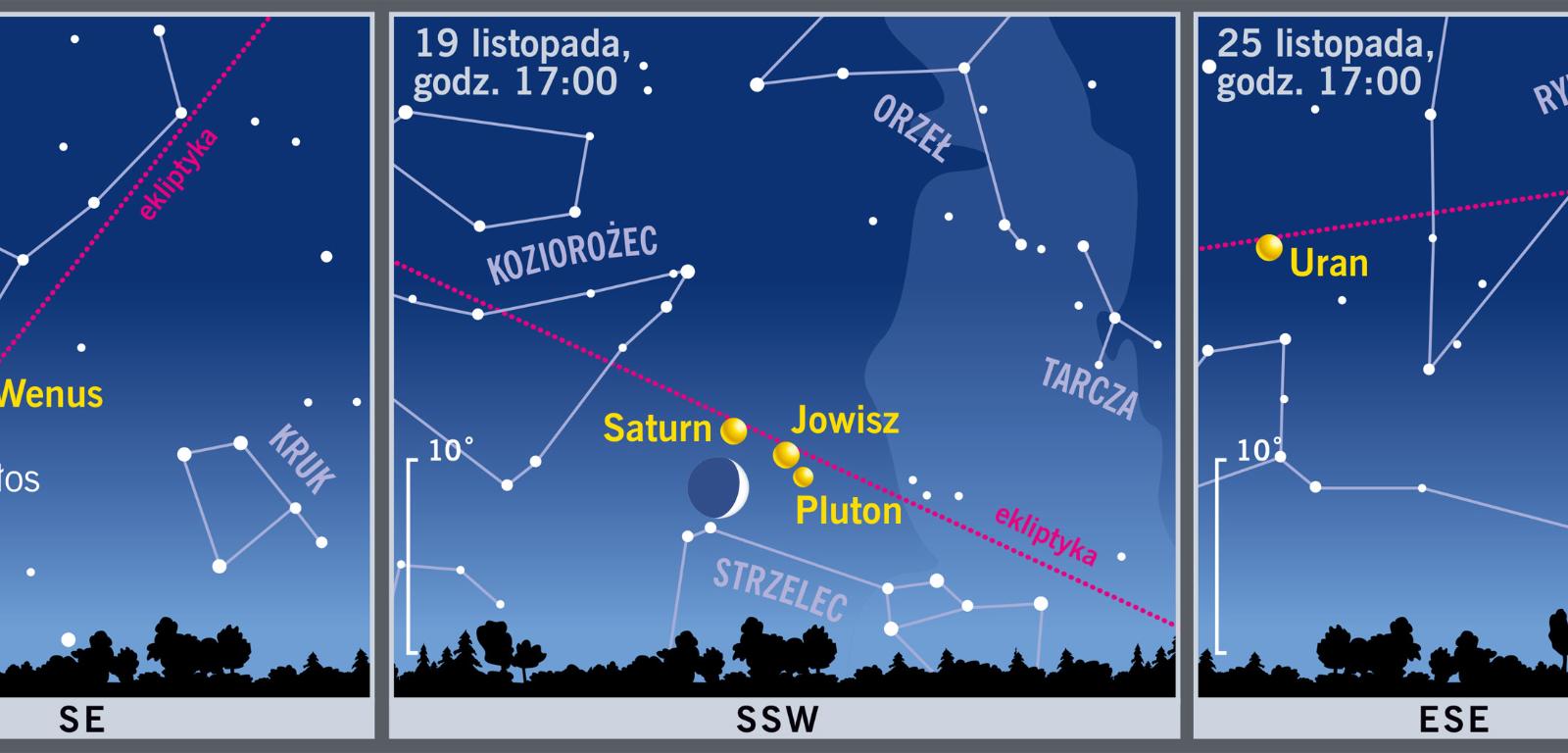 Merkurego (1,4m) zobaczymy w pierwszej połowie miesiąca na porannym niebie. Planeta będzie widoczna na tle gwiazdozbioru Panny. W jej pobliżu dostrzeżemy też Wenus (–3,9m). Marsa (–2,1m) zaobserwujemy w pierwszej połowie nocy w konstelacji Ryb. Jowisz (–2m) i Saturn (0,6m) są widoczne wieczorem na tle gwiazdozbioru Strzelca. Urana (5,7m) poszukajmy w Baranie. Planetę da się podziwiać do wczesnego ranka, a 5 listopada znajdzie się w opozycji do Słońca. Neptun (7,8m) jest widoczny do wczesnego ranka w Wodniku, Pluton (14,3m) – wieczorem w Strzelcu. Ceres (9m) zobaczymy w pobliżu Neptuna w gwiazdozbiorze Wodnika.