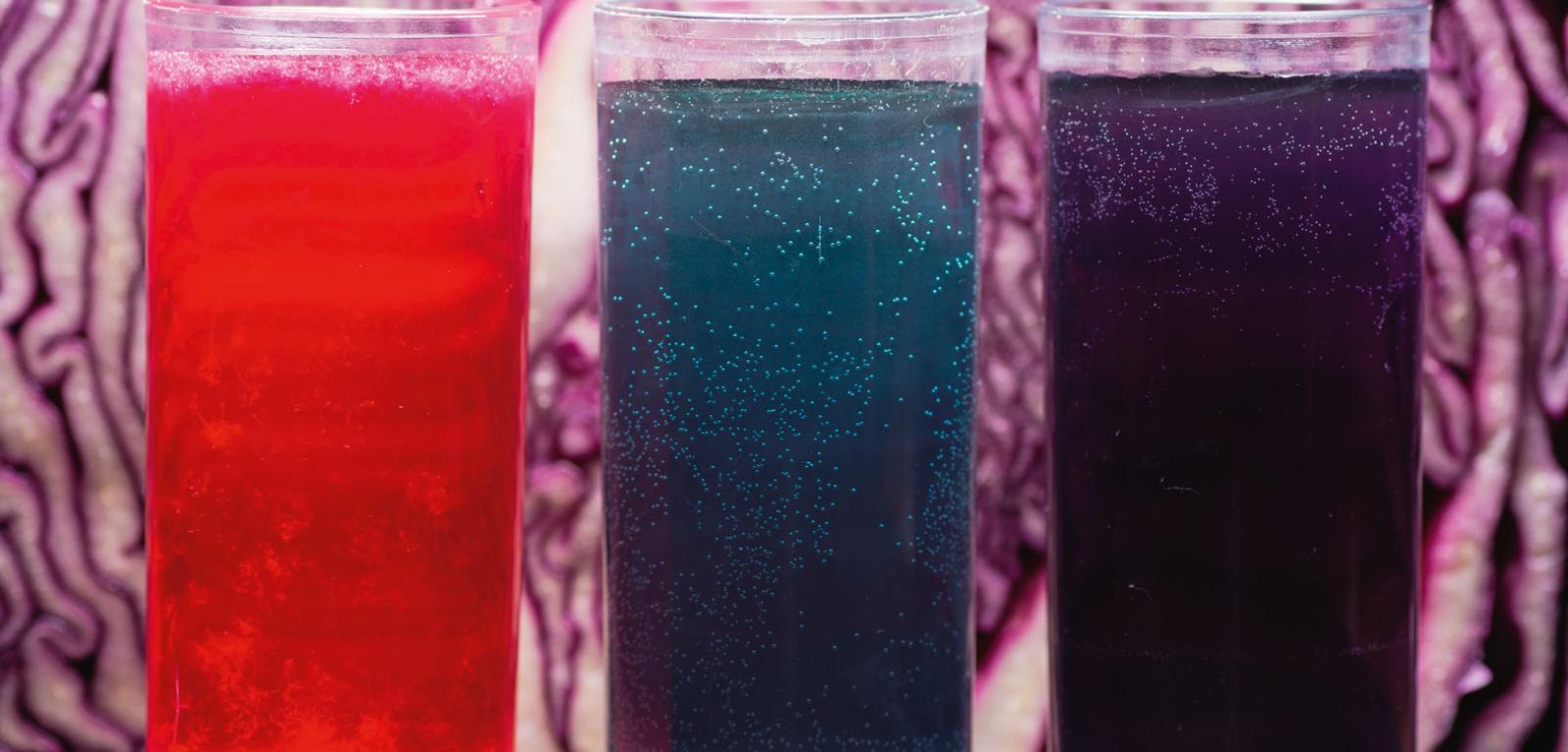Wyjaśnienie: Barwa antocyjanów zawartych w czerwonej kapuście zmienia się m.in. pod wpływem zmian kwasowości (pH) roztworu. Już kilka kropli kwasu (octu) lub zasady sodowej (NaOH, aktywny składnik udrożniacza) powoduje widoczną zmianę zabarwienia – z fioletowej na czerwoną (gdy pH obniża się pod wpływem kwasu) lub na zieloną (gdy pH wzrasta). Ale antocyjany mogą też tworzyć kompleksy z jonami metali, np. glinu zawartego w aktywatorze, i przestają działać jak wskaźnik pH. Dlatego aktywator należy usunąć.
