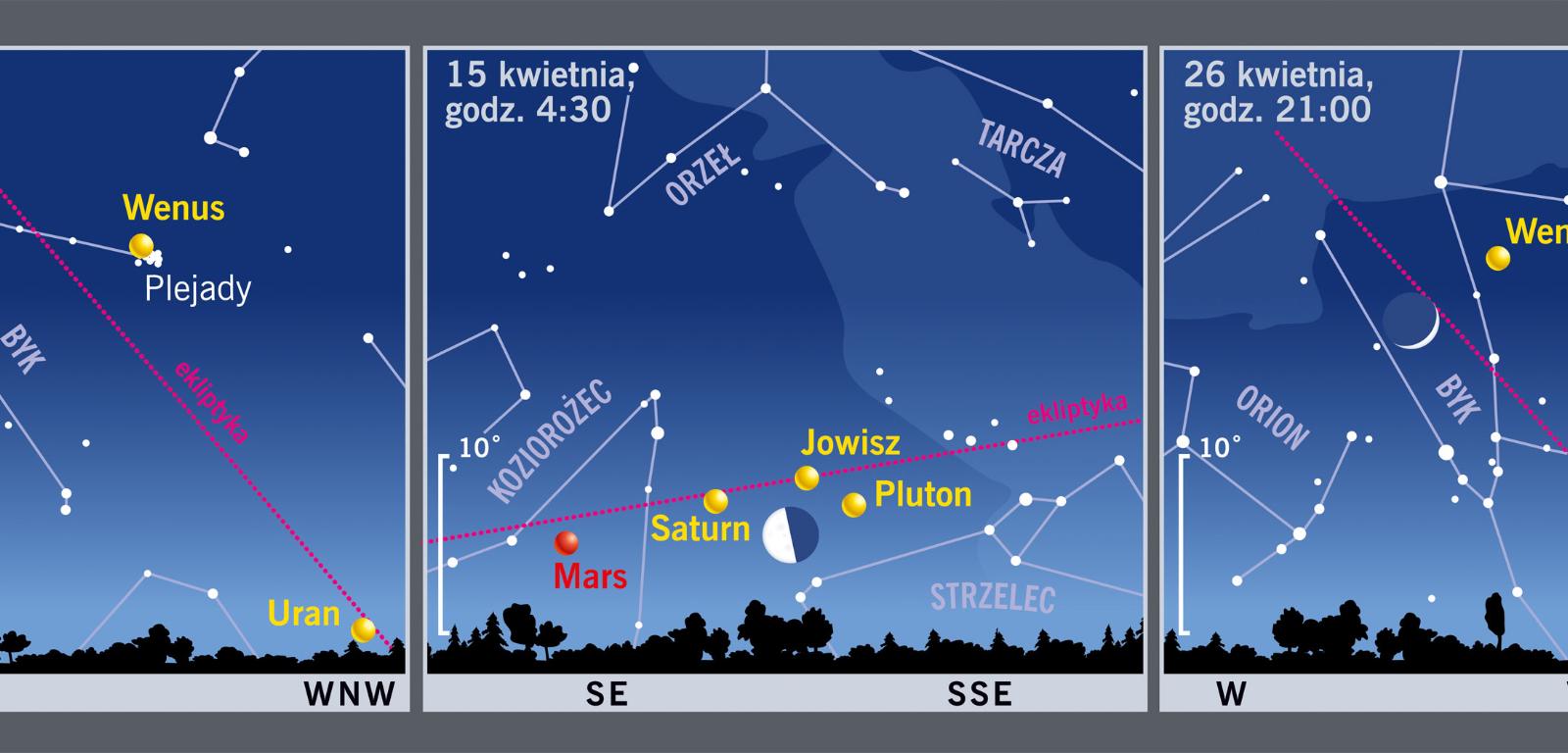 Już 4 kwietnia wieczorem zobaczymy Wenus tuż obok Plejad w Byku. 15 kwietnia nad ranem Księżyc odwiedzi Jowisza i Saturna w Strzelcu. Nieopodal odnajdziemy też Marsa. 26 kwietnia wieczorem wąski sierp naszego satelity będzie widoczny w pobliżu Wenus w Byku.