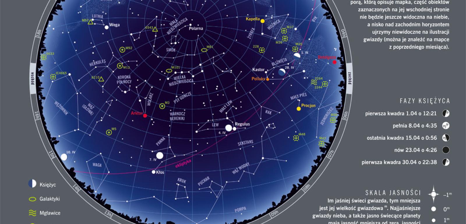 Dzień już coraz dłuższy. Na początku miesiąca słońce wschodzi o 6:10 i zachodzi o 19:11, ale pod koniec miesiąca dzień trwa już od 5:07 do 20:01, a więc niemal dwie godziny dłużej. Maksymalna wysokość naszej gwiazdy nad horyzontem rośnie w kwietniu z 42,6° do 52,8°. Jeśli wyjdziemy na obserwacje wieczorem ok. 21:00, na wschodnim niebie zobaczymy już wiosenne konstelacje Panny, Wolarza i Herkulesa. Orion, symbol zimowego nieba, powoli ginie za zachodnim horyzontem. Nad południowym horyzontem króluje Lew. Miłośnicy bardziej zmiennych zjawisk powinni wyjść na obserwacje w okolicy 22 kwietnia, kiedy spodziewamy się maksimum Lirydów – meteorów wybiegających z konstelacji Lutni. Lirydy to drobne pyłowe pamiątki pozostałe po przelotach komety C/1861 G1 Thatcher. Kometa, której okres obiegu Słońca wynosi ok. 415 lat, ostatni raz gościła w centrum Układu w 1861 r., a jej następnego pojawienia się w tym miejscu doczekają więc zapewne dopiero nasze dalekie prawnuki.