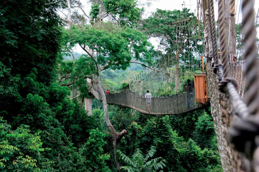 Są też miejsca jeszcze bardziej egzotyczne, wprost zanurzone w naturze. W samym środku Ghany powstał piękny park narodowy Kakum z niesamowitym mostem wiszącym, a właściwie całą grupą siedmiu mostów, dzięki którym wędrujemy w koronach drzew, podziwiając florę i faunę. Most zbudowano głównie z desek, a jego boki chronione są siatką wykonaną z naturalnych lin. Całość ma 330 m długości.
