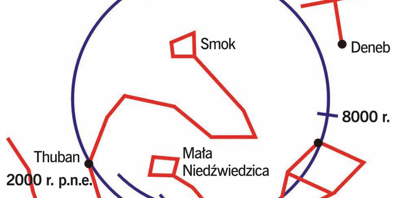 Dotyczy to oczywiście również gwiazd wskazujących północny biegun nieba oraz gwiazdozbiorów zodiakalnych. Kiedy mniej więcej 3 tys. lat temu astrologowie z Mezopotamii stworzyli znaki zodiaku, północny biegun nieba znajdował się niedaleko gwiazdy Kochab. W nią wycelowana była oś ziemska i to wokół tej gwiazdy kręciło się nocne niebo starożytnych Babilończyków oraz Achajów zmierzających na Troję – było to więc także niebo Odyseusza próbującego odnaleźć drogę do Itaki. W tamtych odległych czasach punkt równonocy wiosennej znajdował się w zachodniej części gwiazdozbioru Barana. Dlatego Babilończycy nazwali go punktem Barana i od niego odliczali znaki zodiaku. Ale 3 tys. lat to wystarczająco dużo, aby za sprawą precesji na niebie nastąpiły spore zmiany – punkt Barana, wyznaczający początek astronomicznej wiosny na półkuli północnej, przemieszczając się na zachód w tempie 50 sekund kątowych na rok, już na początku naszej ery przeniósł się do konstelacji Ryb, a za jakieś 500 lat przesunie się do gwiazdozbioru Wodnika. Tak samo przemieściły się znaki zodiaku względem gwiazdozbiorów zodiakalnych. W ciągu 3 tys. lat pokonały one mniej więcej jedną dziesiątą koła, czyli jakiś miesiąc. Dla przykładu osoby urodzone pomiędzy 21 marca a 19 kwietnia uważa się za urodzone pod znakiem Barana, jednak dziś Słońce wcale nie znajduje się w tym gwiazdozbiorze. Tak było 3 tys. lat temu. W naszych czasach Słońce już 11 marca wkracza do konstelacji Ryb, w której przebywa do 18 kwietnia, a dopiero potem przenosi się do gwiazdozbioru Barana. Z każdym kolejnym rokiem przybliża się też moment, gdy początek wiosny (punkt Barana) wyląduje w konstelacji Wodnika.