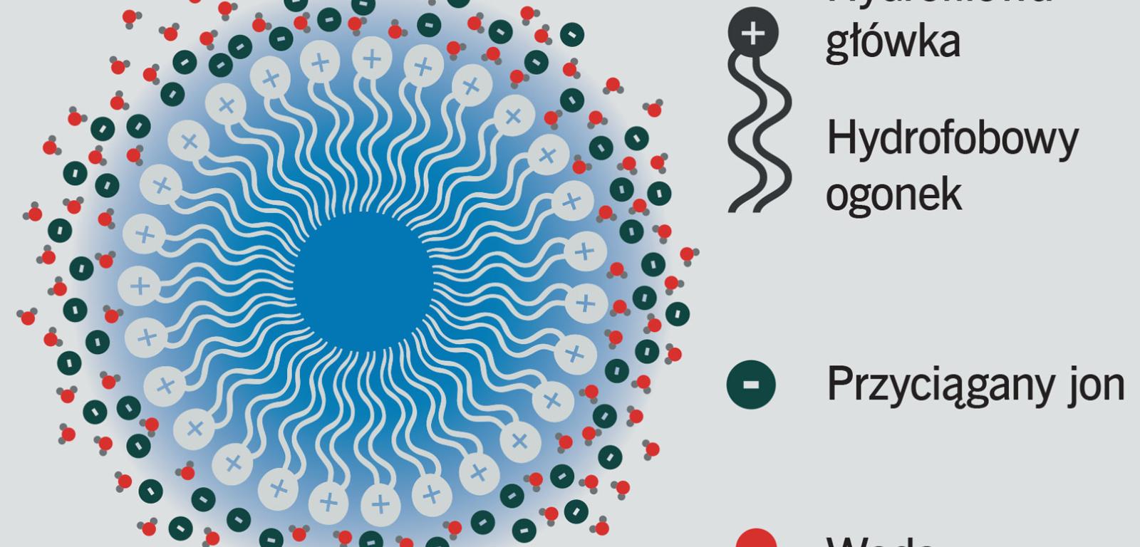 Surfaktanty składają się z części hydrofilowej („kochający wodę”) i hydrofobowej („nienawidzący wody”). Jeśli surfaktanty wrzuci się do wody, dzieje się coś fascynującego: cząsteczki same z siebie formują się i tworzą geometryczne struktury. Skłania je do tego fakt, że hydrofobowe ogony nie chcą mieć do czynienia z wodą i dlatego ustawiają się tak, aby kontakt z nią był jak najbardziej ograniczony. Dlatego tworzą tzw. micele, a robią to w taki sposób, że wszystkie hydrofobowe ogony zwrócone są do wnętrza molekuły, zaś hydrofilowe głowy – w stronę wody. Micele mogą mieć kształt kuli, pałeczki czy robaka.