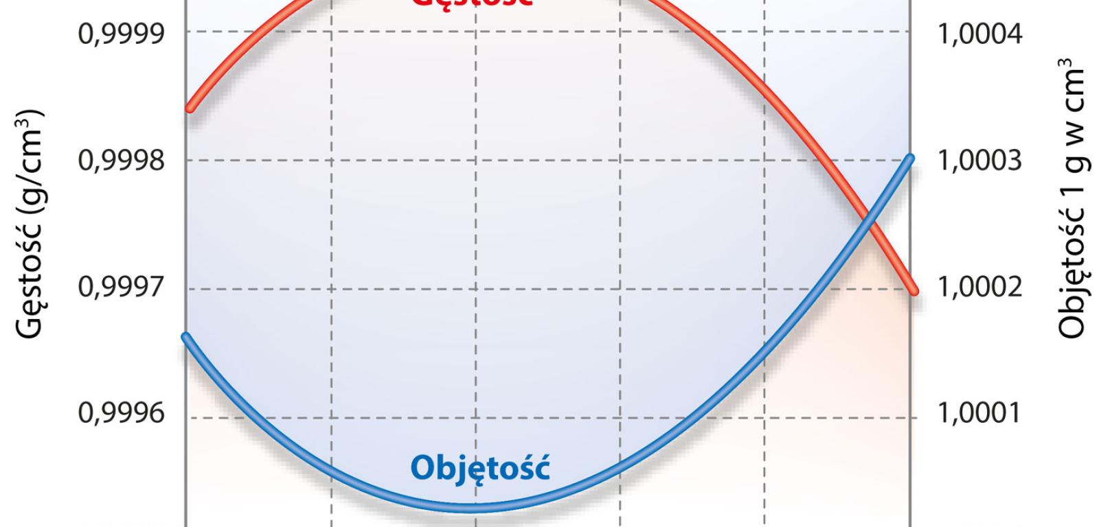 • Woda osiąga maksymalną gęstość w 4°C. W tej temperaturze jej molekuły znajdują się najbliżej siebie.