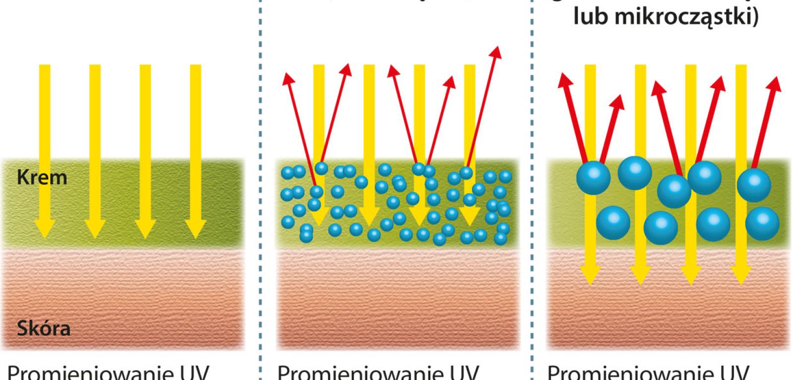 Bardzo popularnymi kremami wykorzystującymi nanotechnologię są te przeciwsłoneczne z dodatkiem nanocząstek tlenku cynku (ZnO) lub ditlenku tytanu (TiO2). W przeciwieństwie do kosmetyków z filtrami chemicznymi (np. awobenzonem), które częściowo pochłaniają promieniowanie UV, zanim dotrze ono do naszej skóry, produkty oparte na nanotechnologii to tzw. fizyczne filtry UV. Szkodliwe promieniowanie jest w nich jednocześnie pochłaniane, rozpraszane i odbijane przez nanocząstki i tylko niewielka jego część przedziera się przez taką barierę. Warto dodać, że mikrocząsteczki ZnO i TiO2 dodawano do kremów przeciwsłonecznych starszej generacji. Nie chroniły jednak przed promieniowaniem UV tak dobrze jak ich następcy oraz tworzyły białawą warstwę na skórze (w mikroskali wymienione tlenki są właśnie białe i dopiero w postaci nanocząstek stają się przezroczyste).