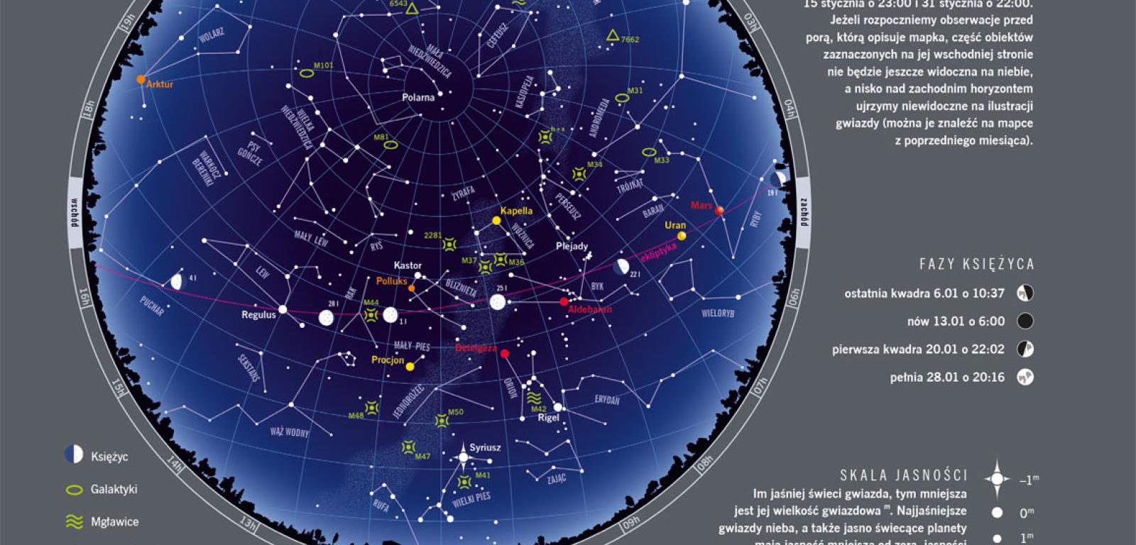 Luty to pierwszy miesiąc, w którym zaczynamy z nadzieją myśleć o wiośnie. Sprzyja temu wydłużający się dzień: na początku miesiąca trwa on od 7:17 do 16:23, a pod koniec prawie dwie godziny dłużej – wschód i zachód słońca następują odpowiednio o 6:24 i 17:14. Wysokość słońca nad horyzontem w południe rośnie w lutym z 20,8° do 30°. Temperatury są często bardzo niskie – stąd dawne określenie „lute mrozy” – ale na Ziemię na naszej półkuli pada coraz więcej słonecznej energii. Ciągle jeszcze możemy się cieszyć jedną z zalet zimy, czyli wyjątkowo pięknym nocnym niebem. Wieczorne wyjścia z domu ozdobi nam więc porywczy myśliwy Orion, w pobliżu odnajdziemy też walczącego z nim Byka. Wschodzi pierwsza nieśmiała zapowiedź wiosny – gwiazdozbiór Lwa. Przy odrobinie szczęścia w okolicy 24. dnia miesiąca możemy zobaczyć wybiegające zeń meteory z roju delta Leonidów.