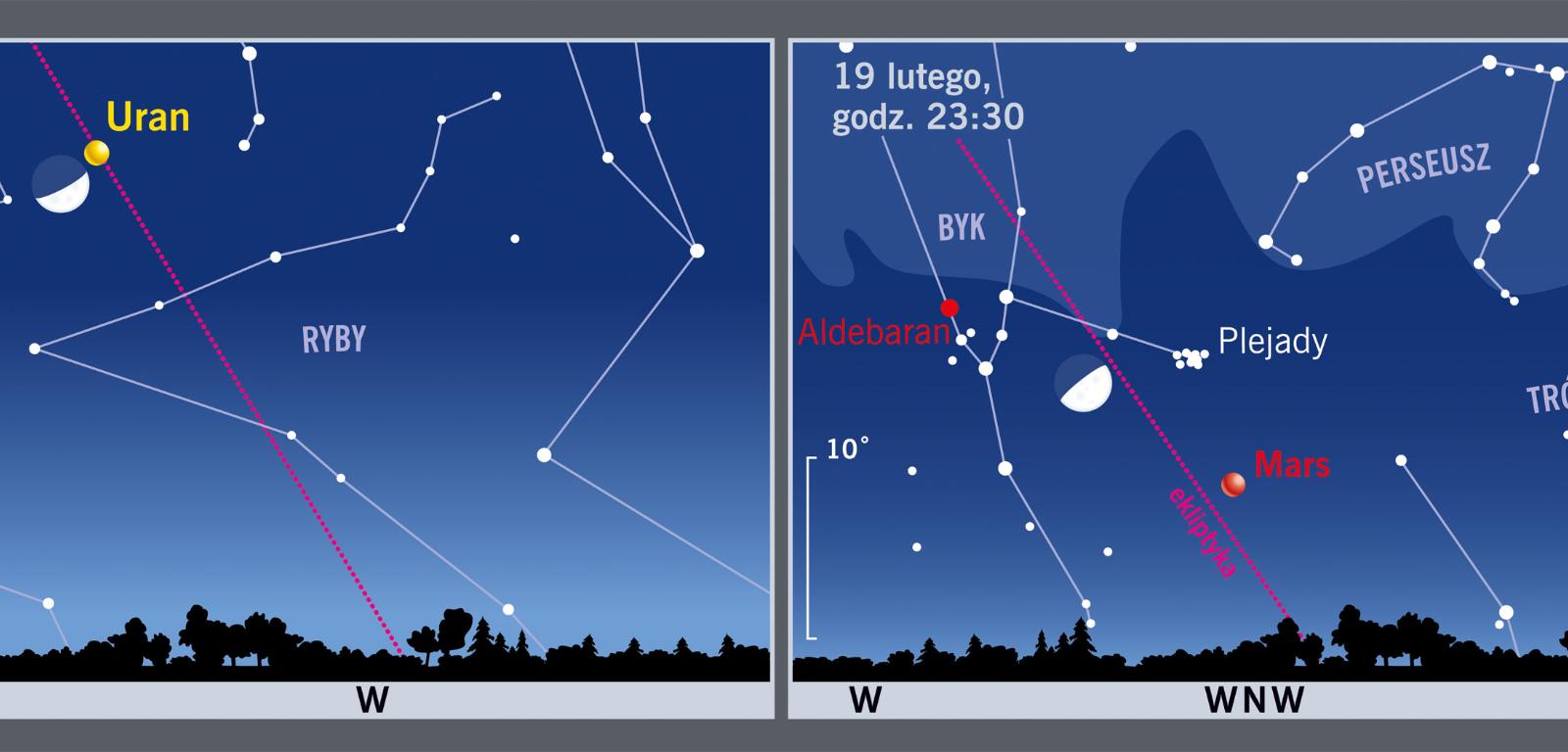 Już 17 lutego zobaczymy Księżyc w pobliżu Urana w konstelacji Wieloryba. Dwa dni później ujrzymy Srebrny Glob koło Marsa i Plejad.