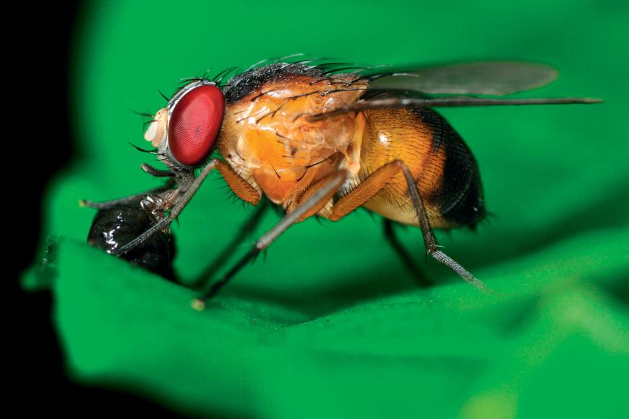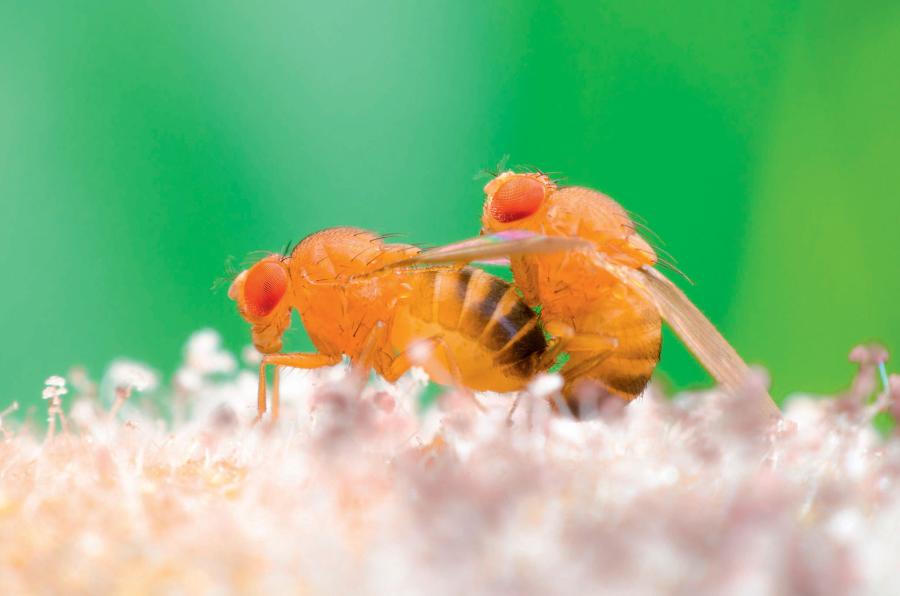 W laboratoriach na całym świecie utrzymuje się tysiące czystych genetycznie linii ras drozofili, niekiedy bardzo zmienionych w stosunku do dzikiej linii wyjściowej. Zasiedlają je szczepy muszek z dwiema parami skrzydeł, podzielonymi oczami i szczególnymi zachowaniami. Te, które się rozmnażają, można trzymać w hodowli (spowolnionej niższą temperaturą). Z kolei niezdolne do rozrodu trzeba pozyskiwać z zamrożonych embrionów. Niedawno rozgłos zdobyła rasa drozofili ze zmodyfikowanym genem fruitless („bezowocny”), zwanym w skrócie fru. Gen ten odpowiada za przebieg zachowań zalotnych u samców. Normalny, dziki i pełen samczych popędów osobnik wykonuje przed samicą ciąg specjalnych znaków wizualnych i sygnałów akustycznych. Kiedy taki samiec zobaczy obiekt choć trochę przypominający samicę, podbiega do niego, wykonuje skłony ciałem i naprzemiennie prostuje skrzydła. Kiedy samica ucieka, podąża za nią, aż uda mu się „poklepać” ją po odwłoku. Wtedy samiec uzyskuje za pomocą smakowych receptorów na stopach potwierdzenie tożsamości obiektu. Jeżeli jest to istotnie receptywna samica, samiec wykonuje serię wibrujących ruchów skrzydeł, nazywanych przez bardziej romantycznie usposobionych badaczy pieśnią miłosną. Kiedy samica pozostaje w miejscu, samiec przytyka na chwilę ssawkę do jej genitaliów i zaraz podejmuje próbę kopulacji. Receptywna samica pozwala na kopulację i rozchyla skrzydła, które samiec podtrzymuje przednimi stopami. Sama kopulacja trwa 10–20 min.