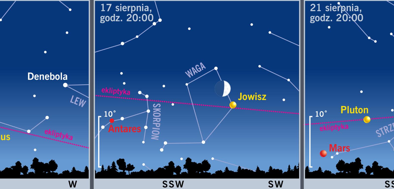 Już 14 sierpnia tuż po zachodzie Słońca zobaczymy wąski sierp Księżyca w pobliżu Wenus w Pannie. 17 sierpnia wieczorem podziwiajmy Srebrny Glob tuż obok Jowisza w Wadze. 21 sierpnia nasz satelita odwiedzi Saturna w Strzelcu. Nieopodal odnajdziemy też Marsa.