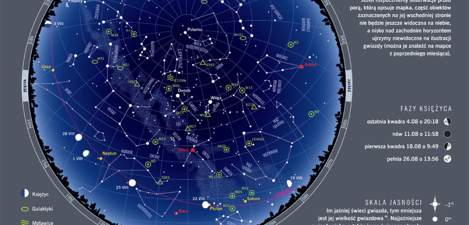 Coraz dłuższe i chłodniejsze noce wieszczą nadchodzącą jesień. Na początku sierpnia Słońce wschodzi o 4:57, by zajść o 20:27, pod koniec miesiąca obie te pory przesuwają się ku 5:46 i 19:26. Maksymalna wysokość Słońca nad horyzontem maleje w sierpniu z 55,7° do 46,3°. Jeśli pogoda dopisze, dłuższe noce możemy wykorzystać na obserwacje nieba. Jego główną atrakcją będą oczywiście Perseidy, zwane też łzami świętego Wawrzyńca. Maksimum roju przewidywane jest na noce z 11 na 12 i 13 sierpnia. Wybierzmy się więc na polowanie na spadające gwiazdy! Najlepiej nastawić się na późnowieczorne lub wręcz przebiegające po północy obserwacje, gdyż radiant roju znajdujący się w gwiazdozbiorze Perseusz wschodzi w drugiej połowie nocy. Jednak i wcześniej możemy zobaczyć sporo spadających gwiazd, wybiegających zwłaszcza z północno- -wschodniej części nieba. Przy dobrych warunkach należy się spodziewać obserwacji ok. 60 meteorów w ciągu godziny. Jeśli pogoda nie dopisze, na obserwacje można się też wybrać innej nocy, Perseidy promieniują bowiem od 17 lipca do 24 sierpnia. A jeżeli Perseidy nas zawiodą, wybierzmy się na obserwacje gwiazdozbiorów: unoszących się jeszcze wysoko Lutni, Herkulesa i Orła oraz wschodzącego Pegaza.