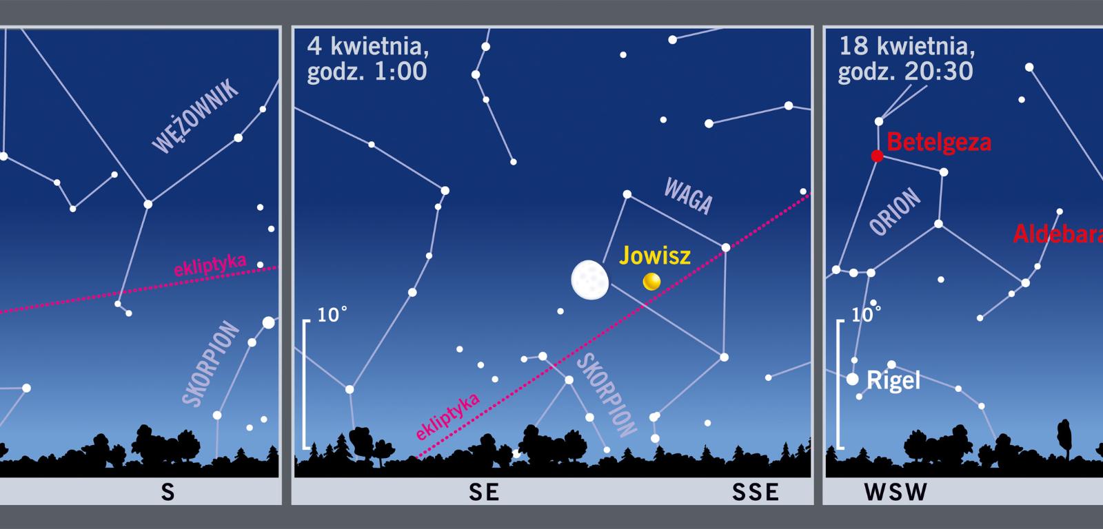 Już 2 kwietnia nad ranem zobaczymy w Strzelcu Marsa tuż obok Saturna. 4 kwietnia Księżyc odwiedzi Jowisza w Wadze. 18 kwietnia wieczorem wąski sierp naszego satelity będzie widoczny w pobliżu Wenus w Byku.