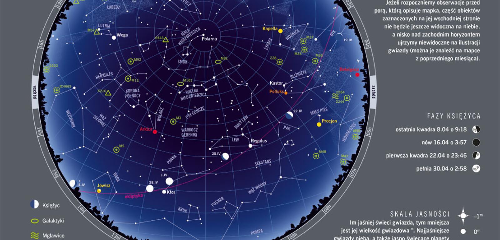 W kwietniu dni są już wyraźnie dłuższe od nocy. Na początku miesiąca Słońce wschodzi o 6:11 i zachodzi o 19:10, ale pod jego koniec dzień trwa już od 5:08 do 20:00, a więc niemal dwie godziny dłużej. Maksymalna wysokość naszej gwiazdy nad horyzontem rośnie w kwietniu z 42,4° do 52,6°. A w nocy czas na obserwacje. Największą atrakcją nieba będą zapewne w tym miesiącu Lirydy – meteory wybiegające z konstelacji Lutni. Ich maksimum spodziewamy się około 22 kwietnia, czyli przy księżycowej pierwszej kwadrze. Warunki do obserwacji będą więc lepsze w drugiej połowie nocy. Lirydy to odłamki pozostałe na torze komety C/1861 G1 Thatcher, która obecnie znajduje się ponad sto razy dalej od Słońca niż Ziemia. Prócz Lirydów oglądajmy też znane od dawna konstelacje unoszącej się wysoko Wielkiej Niedźwiedzicy, a na południu – Lwa, Panny i Hydry.