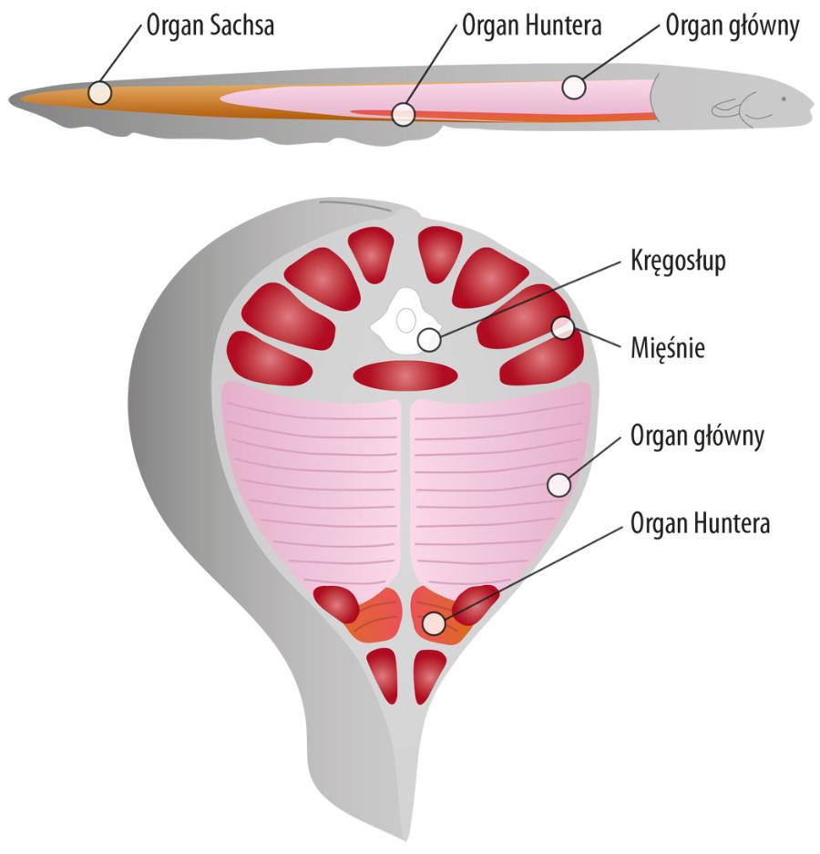 Narządem elektrycznym ryb jest przekształcona tkanka mięśniowa, tzw. organ główny, Huntera oraz Sachsa. W tych strukturach znajdują się tysiące komórek zwanych elektrocytami, które czasem zajmują ponad połowę masy ryby. Naładowanie powierzchni elektrocytu następuje dzięki przerzucaniu tam z wnętrza komórki jonów dodatnich. Wewnętrzna strona błony komórkowej ze względu na ich niedobór staje się naładowana ujemnie. Przypomina to baterię z biegunami dodatnim i ujemnym. Wyładowania (przepływ jonów przez błonę komórkową) następują seriami krótkich (wartości w milisekundach) impulsów, po czym na chwilę ustają, aby wyjściowy układ ładunków mógł się zregenerować.