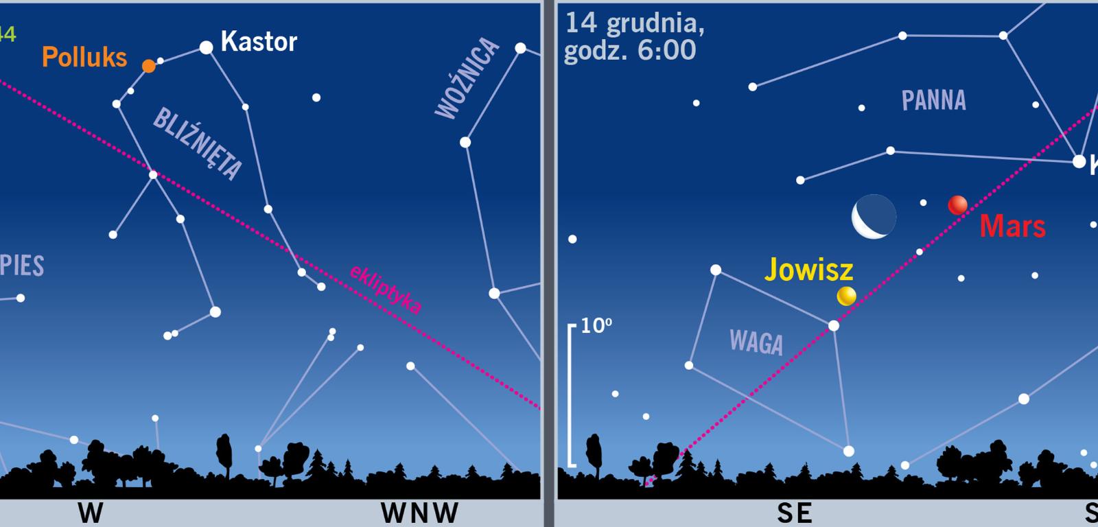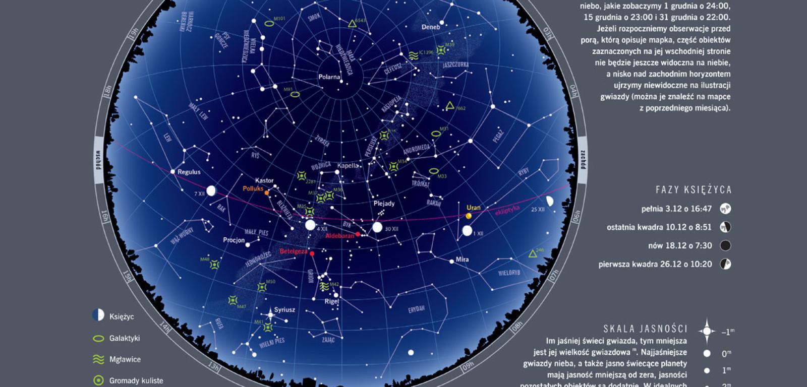 Po deszczowym listopadzie nadeszła zima. A dokładniej – rozpoczyna się ona 21 grudnia o 17:28. Od tej chwili powoli, lecz nieustannie, dzień się wydłuża, a noc – kurczy. Pierwsza zimowa noc potrwa od 15:25 do 7:44, a więc ponad 16 godz. Niewiele krótsza będzie noc wigilijna, podczas której wiele osób będzie wypatrywać pierwszej gwiazdki. W tym roku niebo niczego nam nie ułatwi – gwiazdki nie zastąpi żadna jasna planeta. Czego więc wypatrywać? Dużo zależy od tego, w którym kierunku mamy najlepszy widok nieba.