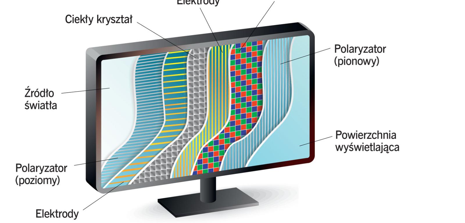 Wyjaśnienie: Monitor LCD emituje światło spolaryzowane. Ma on aż dwa filtry polaryzacyjne. Światło, przechodząc przez pierwszy z nich, zostaje spolaryzowane w jednym, konkretnym kierunku, a następnie pada na matrycę zawierającą ciekłe kryształy, które – w zależności od przyłożonego napięcia – mogą skręcić płaszczyznę jego polaryzacji, gdy będzie przechodziło przez konkretny piksel, ale nie muszą. Teraz światło pada na drugi filtr, ustawiony tak, aby wygaszać światło przepuszczane przez pierwszy filtr. Zatem jedynie światło o polaryzacji zmienionej przez ciekłe kryształy jest w stanie przebić się przez drugi filtr. Pozwala to na selektywne włączanie i wyłączanie określonych pikseli. Przejście przez drugi filtr oznacza zarazem, że światło monitora jest spolaryzowane w określonej płaszczyźnie i za pomocą „soczewki” okularów możemy je wygasić.