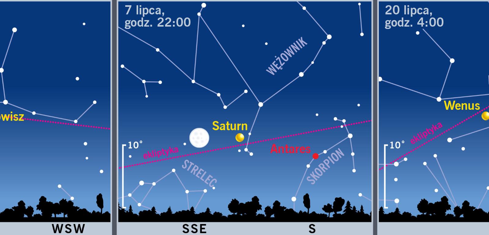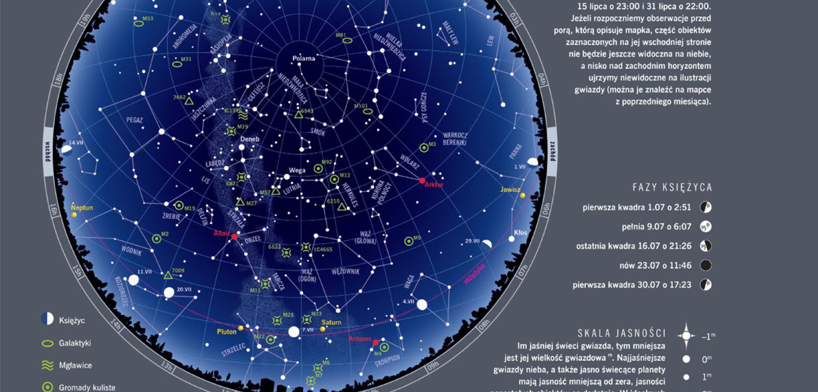 Trwa lato. Na początku miesiąca Słońcem cieszymy się od 4:19 do 21:01, pod koniec miesiąca – od 4:56 do 20:29. Maksymalna wysokość, na jaką nasza gwiazda wznosi się nad horyzont, wynosi na początku lipca 60,8°, by z jego końcem zmaleć do 55,9°. Paradoksalnie słoneczna tarcza obserwowana w trakcie lata jest najmniejsza: 3 lipca Ziemia znajdzie się na swej orbicie najdalej od macierzystej gwiazdy. Odległość między naszą planetą a Słońcem wyniesie wówczas aż 152,1 mln km, a więc o ponad 5 mln km więcej niż w styczniu.