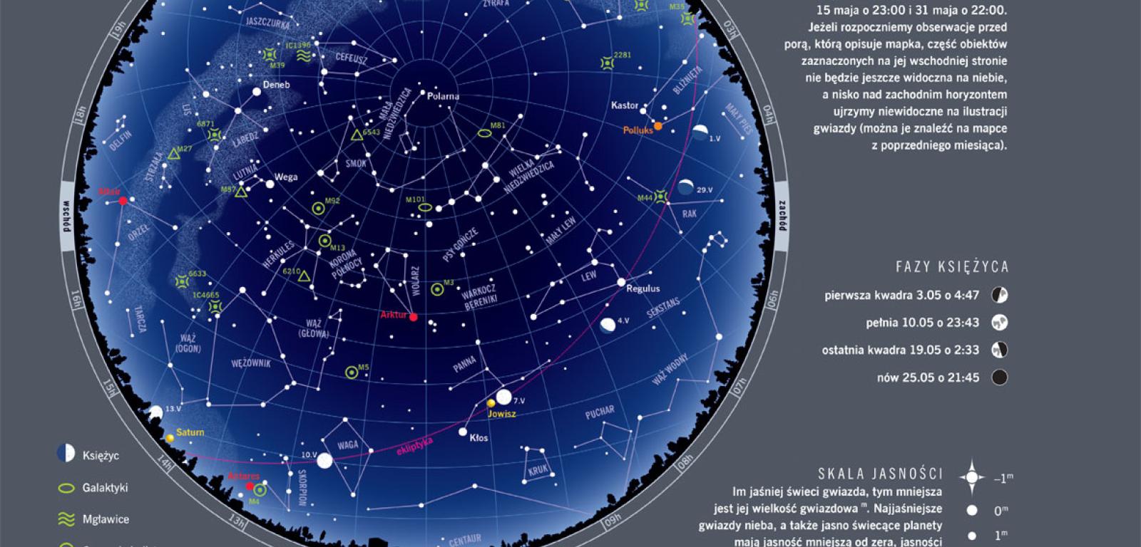 Maj to ostatni pełny miesiąc wiosny. Widać to nie tylko po średniej temperaturze, ale i bardzo długim dniu: na początku miesiąca trwa on od 5:06 do 20:02, a pod koniec miesiąca – od 4:23 aż do 20:46. Maksymalna wysokość Słońca nad horyzontem rośnie w maju z 53,0° do 59,6°. Jak co roku w maju żegnamy noc astronomiczną, czyli okres, w którym Słońce jest schowane co najmniej 18° pod horyzontem. Od 17 maja aż do 25 lipca niebo nie będzie więc całkiem ciemne nawet w samym środku nocy.