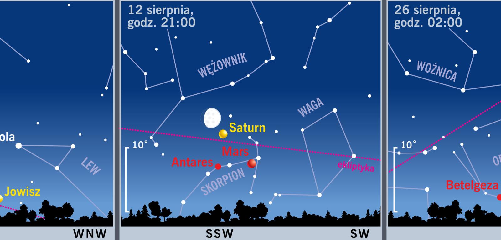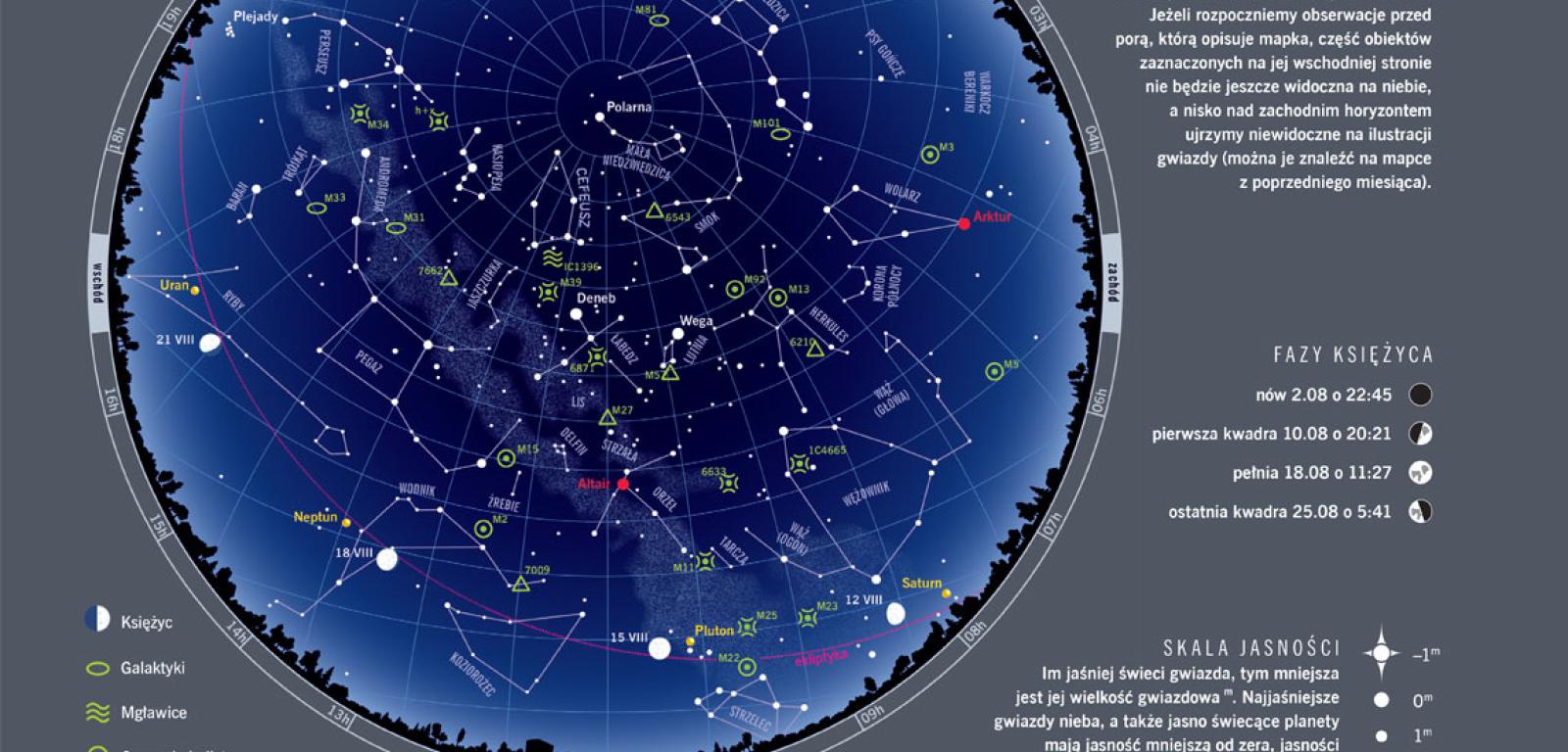 Powoli zbliża się jesień. Na początku sierpnia Słońce wschodzi o 4:58, by zajść o 20:26. Pod koniec miesiąca obie te pory przesuwają się ku 5:46 i 19:25. Maleje też maksymalna wysokość Słońca nad horyzontem z 55,6° do 46,2°. Coraz dłuższe noce i wolny czas w okresie wakacyjno-urlopowym ułatwiają astronomiczne obserwacje. Jak co roku wydarzeniem sierpnia będą Perseidy – meteory wybiegające z konstelacji Perseusza. W tym roku ich maksimum przewidywane jest na noc z 12 na 13 sierpnia.