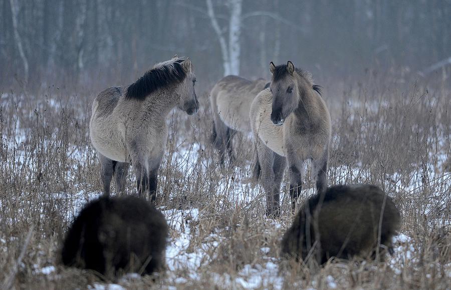 Najbardziej zafascynowało mnie wspólne żerowanie koników z jedną z małych watah dzików. Grupa kilku dzików najwyraźniej polubiła stado konika polskiego. Kilkakrotnie już miałem przyjemność obserwowania obu tych gatunków na wspólnym posiłku. Ponieważ widywałem je w różnych miejscach, zwierzęta te musiały razem przemieszczać się po terenie. Co ciekawe, gdy napotykałem dziki żerujące samotnie, zawsze na mój widok reagowały paniczną ucieczką. Natomiast bytując razem z tabunem koni, o dziwo, zachowywały się zupełnie inaczej. Chodziły spokojnie, dosłownie pomiędzy końmi, a nawet pomiędzy ich nogami. Zupełnie też nie reagowały na mnie, zbliżając się nawet na wyciągnięcie ręki. Jak widać na tym przykładzie, dziki na czas pobytu w tabunie koni powierzały im odpowiedzialność za swoje bezpieczeństwo. Do tego stopnia im ufały, że nawet ich największy wróg – człowiek – nie stanowił dla nich zagrożenia. To było fantastyczne uczucie znaleźć się w środku końskiego tabunu i pomiędzy watahą dzików. Poczułem się jak pełnoprawny mieszkaniec ich terytorium.