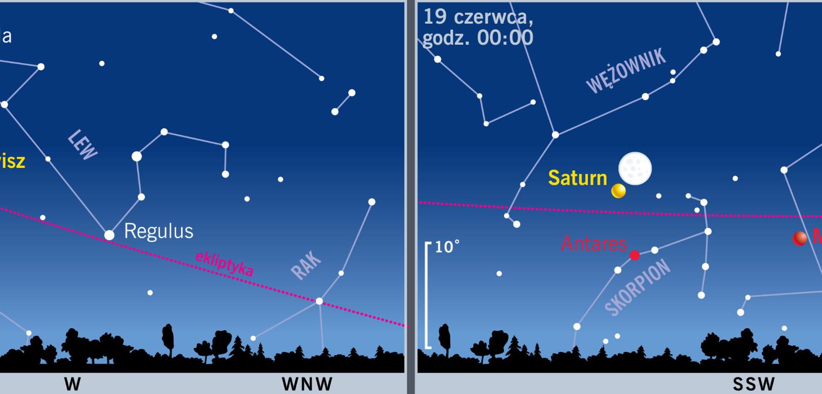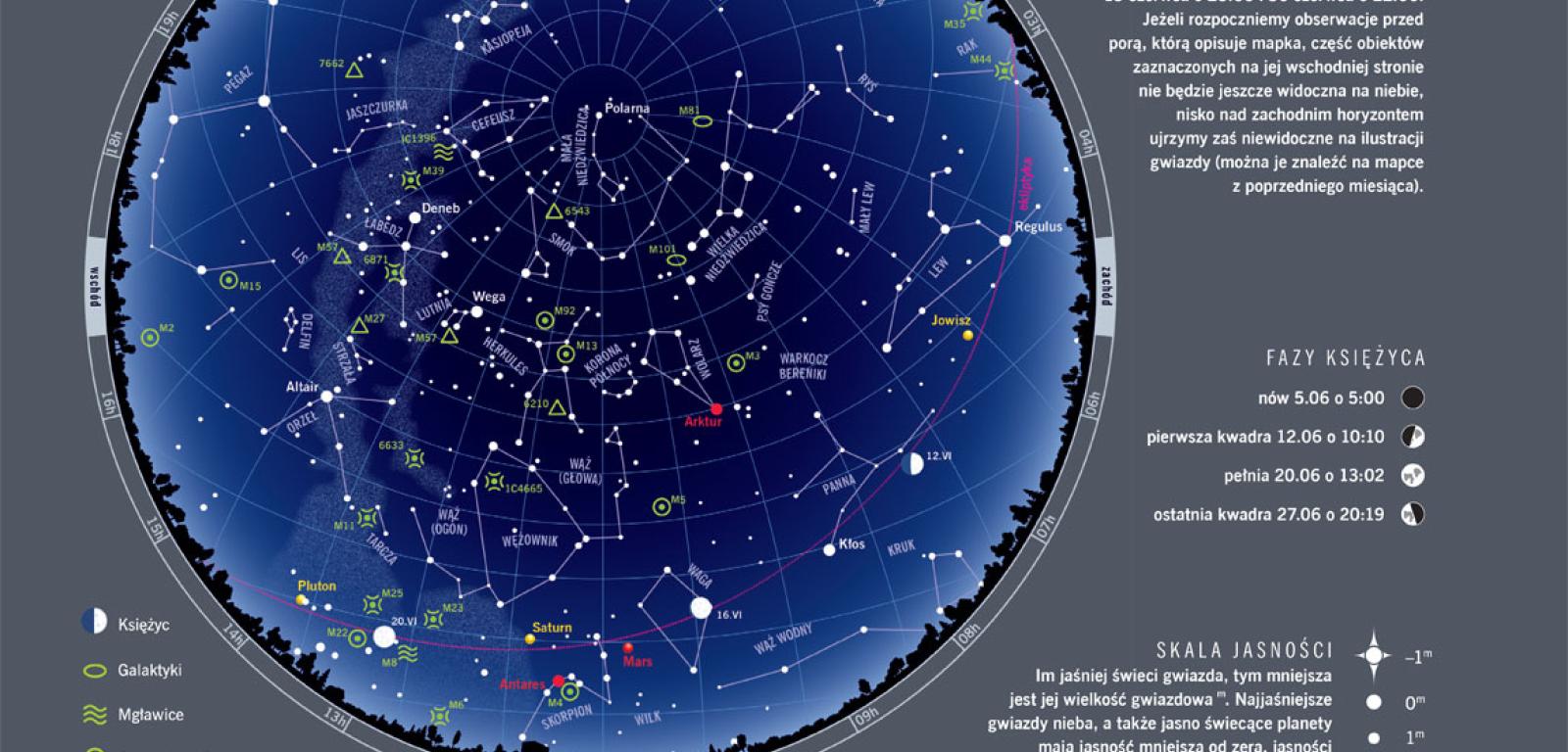 Lato nadejdzie w tym roku 21 czerwca wkrótce po północy, bo o 0:34. Tego dnia Słońce wzniesie się na maksymalną w roku wysokość, wynoszącą w Warszawie o 12:38 aż 61,2°. Pozostałe dni będą również słoneczne i długie: na początku miesiąca Słońce wschodzi o 4:21 i zachodzi o 20:48, a pod koniec miesiąca obie te pory przesuwają się nieznacznie do 4:18 i 21:01. Jeśli wyjdziemy z domu godzinę lub lepiej dwie po zachodzie Słońca, możemy rozpocząć nocne obserwacje. Od 10 do 21 czerwca niebo będą przecinały czerwcowe Lirydy wybiegające z konstelacji Lutni.