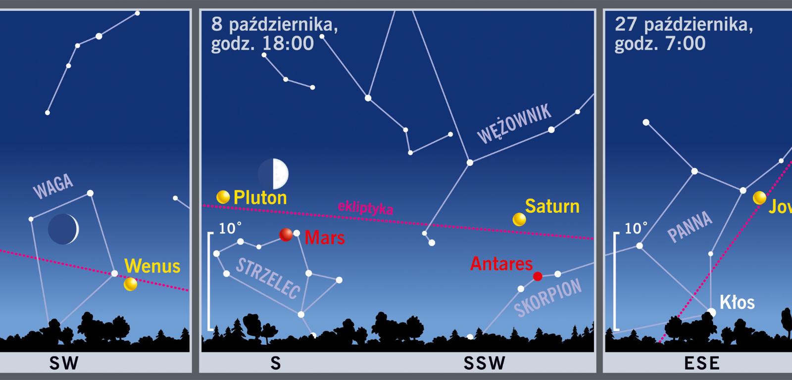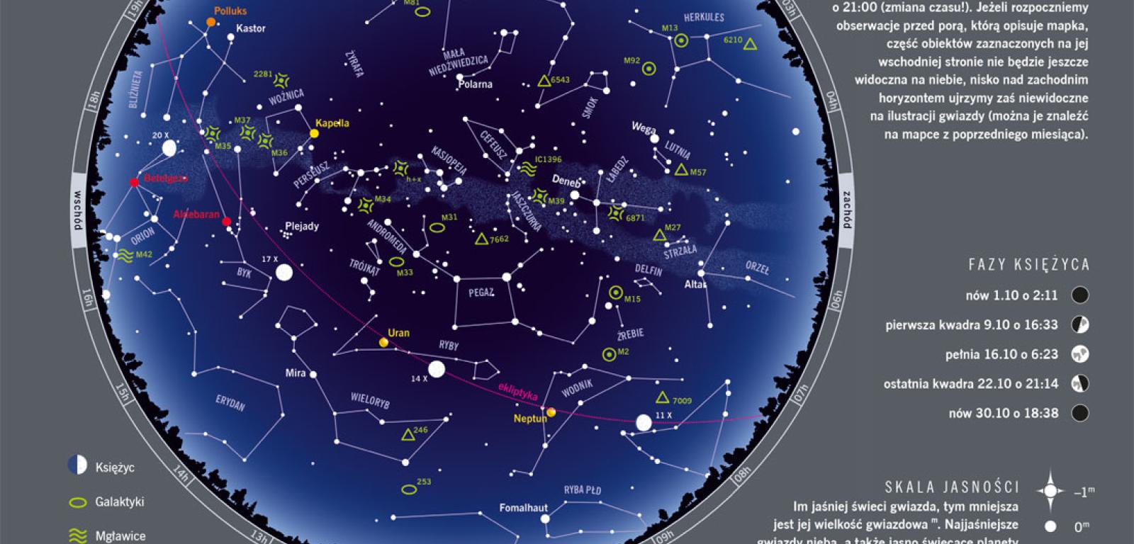 Jesienne noce są coraz dłuższe. Na początku miesiąca Słońce wschodzi o 6:38, by zajść o 18:13. Pod koniec miesiąca dzień trwa już tylko od 6:30 do 16:08. Duże przesunięcie pory zachodu wynika ze zmiany czasu: 30 października przestawimy zegarki z godziny 3:00 na 2:00 w nocy. Maksymalna wysokość Słońca nad horyzontem maleje w październiku od 34,3° do 23,9°. Dłuższe i ciemniejsze noce rozjaśnią nam meteory. Na początku miesiąca z konstelacji Woźnicy będą wybiegały Delta Aurygidy, później na niebie napotkamy Drakonidy i Orionidy.