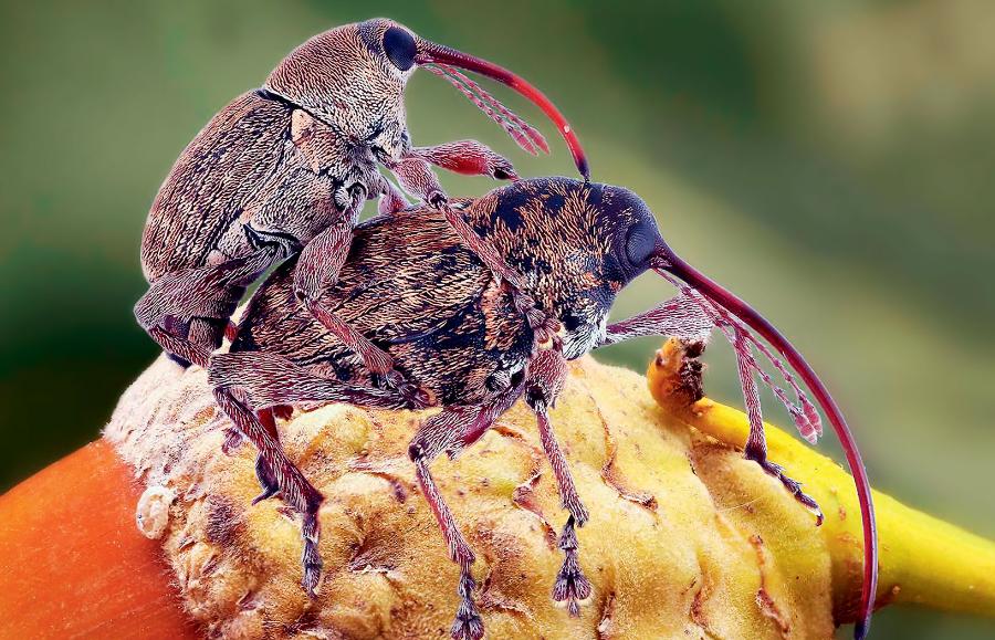 Co „wyciągnęło” słonikom ryje do tak ekstremalnej długości, że zdarza się, iż przy próbie wygryzania otworu jajowego windują one całe ciało samicy do góry – jak tyczka skoczka – uniemożliwiając jej uchwycenie się nogami podłoża? Angielscy entomolodzy Joseph Hughes i Alfried P. Vogler, zestawiając ryje wielu przedstawicieli słoników (plemię Curculionini – mamy ich w naszej faunie 11 gatunków) z ich obiektami żywicielskimi: żołędziami, kasztanami, orzechami i owocami, doszli do wniosku, że ewolucja wydłużała ryj u tej grupy chrząszczy, dostosowując go do gabarytów obiektów żywicielskich. Ale czy tylko dlatego?