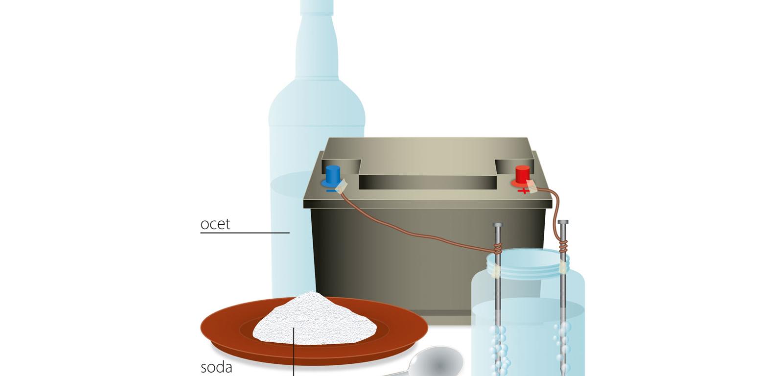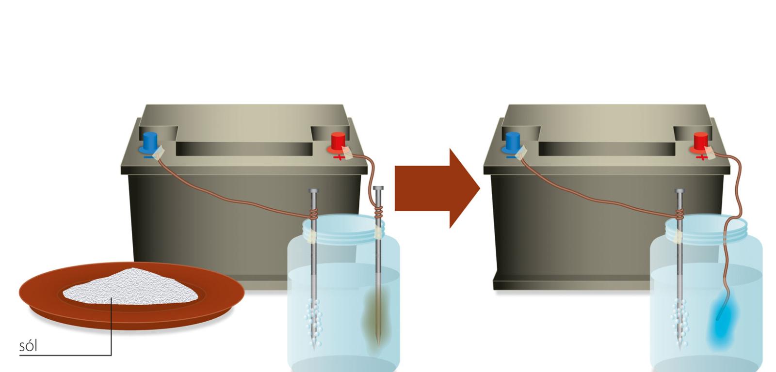Do końcówek ogniwa przymocuj (np. taśmą klejącą lub izolacyjną) pozbawione izolacji końce miedzianych przewodów. Do wolnych części kabelków dołącz gwoździe uprzednio oczyszczone z powierzchniowych nalotów. Sprawdź prawidłowość połączenia, mierząc napięcie pomiędzy gwoździami. Do małego słoiczka wlej wodę i zanurz w niej gwoździe (uważaj, aby się nie stykały; gwoździe możesz przymocować do górnej części słoiczka plasteliną lub taśmą). Obserwuj powierzchnie gwoździ.