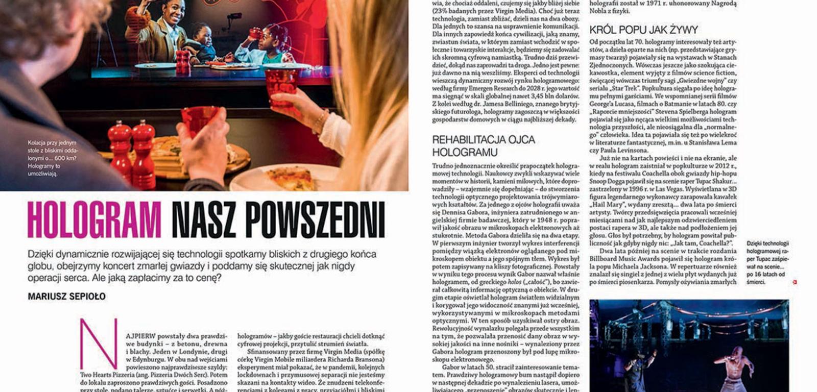 W sierpniowym numerze WIŻ zamieściliście artykuł „Hologram nasz powszedni” pana Mariusza Sepioło. Autor opisuje tam zasadę działania hologramu oraz przedstawia „Two Hearts Pizzeria Virgin Media” i trójwymiarowe projekcje postaci na scenie jako przykłady implementacji. Niestety z przykrością muszę przyznać, że autor wprowadza w błąd czytelników. Powyższe przykłady mają niewiele wspólnego z hologramem, gdyż wykorzystują unowocześnioną wersję XIX-wiecznej projekcji Pepper’s ghost.