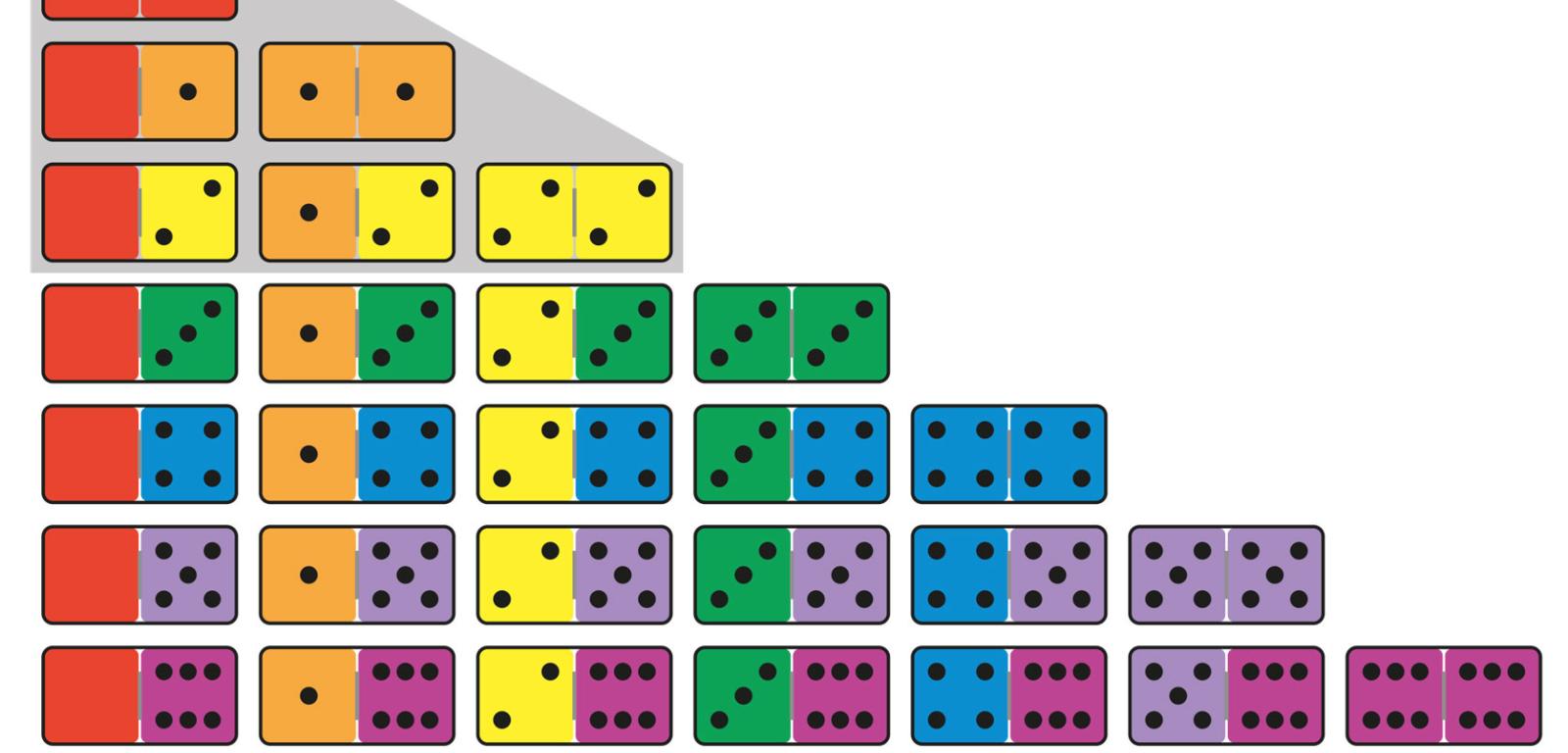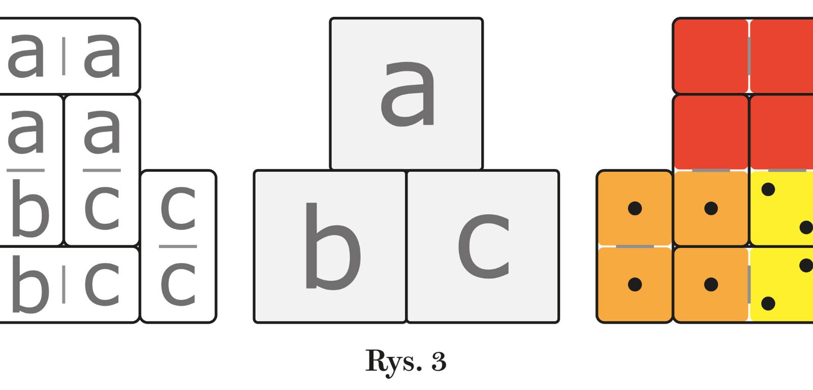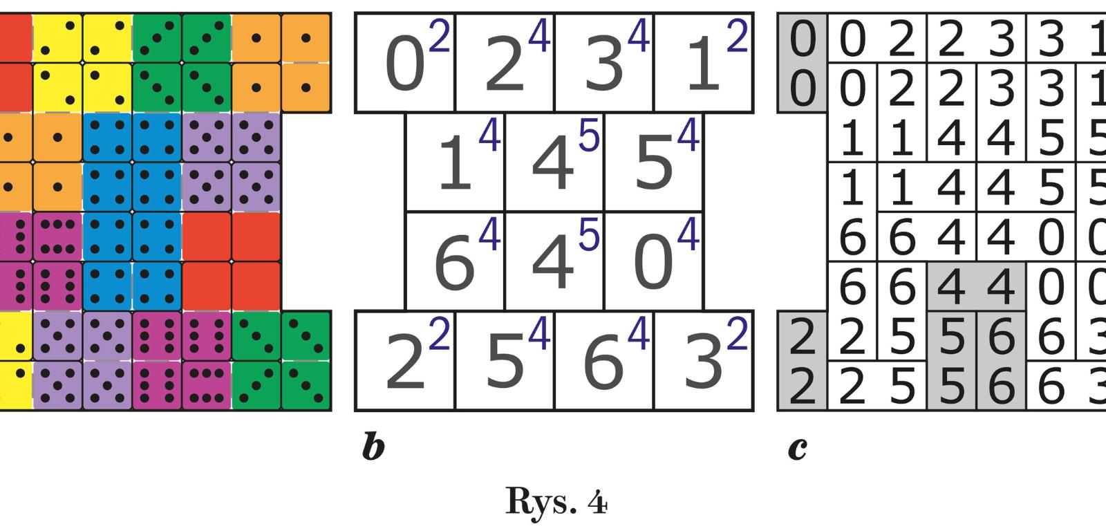 Typowy, tradycyjny komplet domina (rys. 1) nazywamy szóstkowym, ponieważ szóstka jest największą liczbą oczek na połówkach 28 kamieni. Komplet obejmuje wszystkie pary liczb od zera do sześciu, ale można z niego wyodrębniać mniejsze komplety. Podkomplet dwójkowy, złożony z sześciu kamieni (rys. 1 u góry, na szarym tle), jest najmniejszym, którego wydzielenie ma sens, ponieważ przydaje się do paru prostych łamigłówek. Jedna z nich polega na ułożeniu kamieni w taki sposób, aby każde ich cztery połówki z jednakową liczbą oczek tworzyły kwadrat 2×2, a więc w przypadku kolorowego domina powinny powstać trzy połączone kwadraty – każdy w innym kolorze. Łatwo zauważyć, że możliwe są tylko trzy układy z trzech kamieni, których cztery połówki tworzą wymagany kwadrat (rys. 2). Pierwszy układ należy jednak odrzucić, bo połówki b i c są za daleko od siebie, więc nigdzie nie uda się umieścić kamienia b-c. Dwa pozostałe układy prowadzą do geometrycznie jedynego rozwiązania (rys. 3; w środku schemat ogólny zwany komórkowym). Arytmetycznie rozwiązań jest sześć, bo każdą literę można zastąpić dowolną z trzech liczb – jeden z konkretnych układów na rys. 3 z prawej.