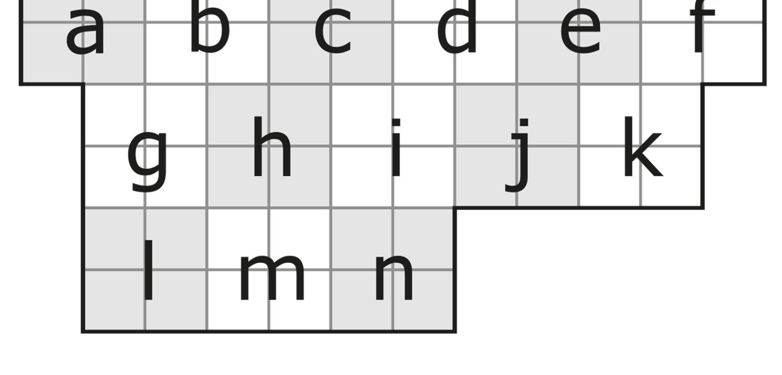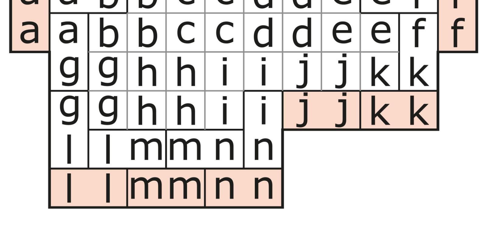 Jedyna możliwa pozycja dubletów w komórkach a i f pozwala wyznaczyć granice sąsiednich kamieni. Następnie łatwo ustalić konieczne pozycje dubletów w komórkach l, m, n oraz k i na końcu j – inne pozycje doprowadziłyby do powtórzenia się kamieni. W ten sposób siedem różowych dubletów i kilka sąsiednich kamieni trafia na swoje miejsca (rys. 9). Dalej jak po sznurku można dokończyć całą „ramę”, czyli narysować granice wszystkich kamieni, a potem, dla usprawnienia rozwiązywania, przypisać dubletom konkretne liczby (rys. 10). Warto też zauważyć, że niejako przy okazji ujawnione zostały trzy kamienie: 1–3, 4–5 i 5–6.