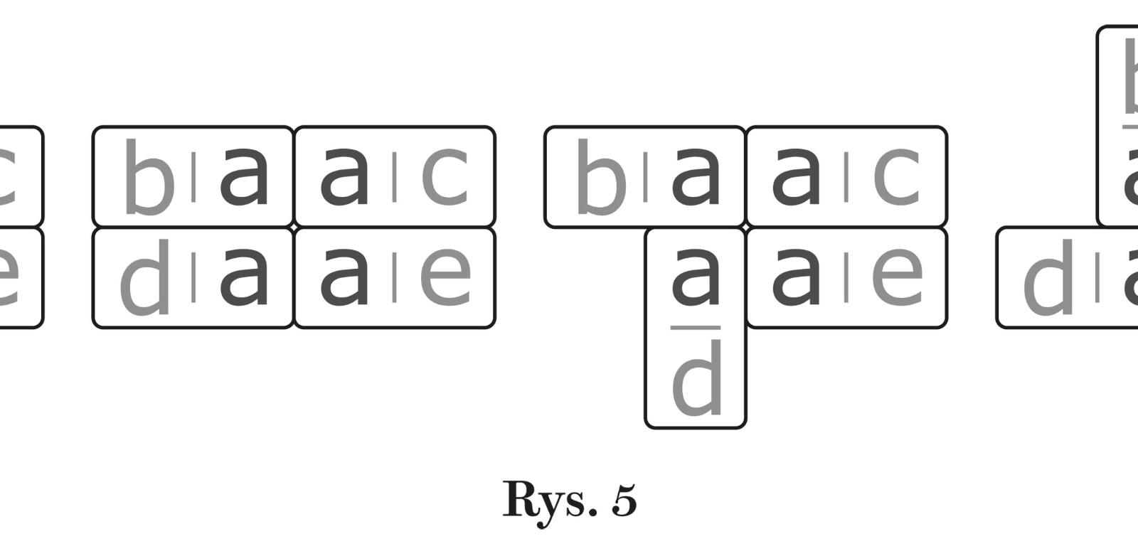 Kluczem do konstruowania kwadryla są także możliwe układy trzech lub czterech kamieni tworzących komórkę. Jeśli kamienie są trzy, to jest wśród nich dublet, a możliwe układy są trzy (rys. 2). Jeżeli natomiast komórkę tworzą połówki czterech kamieni, to różne ich układy mogą być cztery (rys. 5).