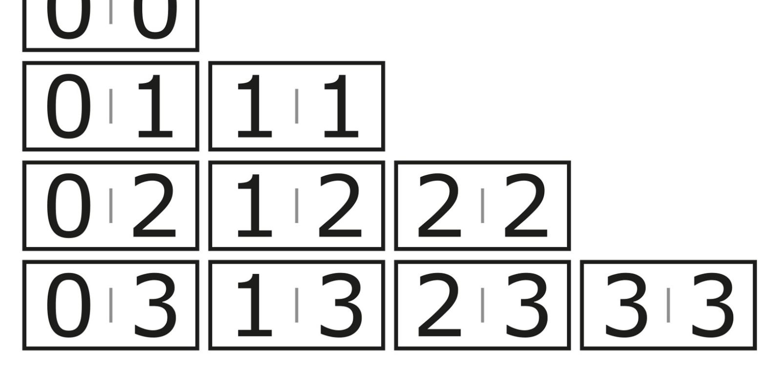 3. Z trójkowego kompletu domina liczącego 10 kamieni (rys. 13) zrobić kwadryl nie sposób, bo każda liczba występuje w nim pięciokrotnie. Można jednak utworzyć tzw. q-kwadryl. To wielokąt złożony z pięciu komórek, z których każda składa się z czterech różnych liczb – 0, 1, 2 i 3. Zadanie polega na ułożeniu z trójkowego kompletu takiego q-kwadryla, który będzie miał najmniejszą możliwą liczbę kątów.