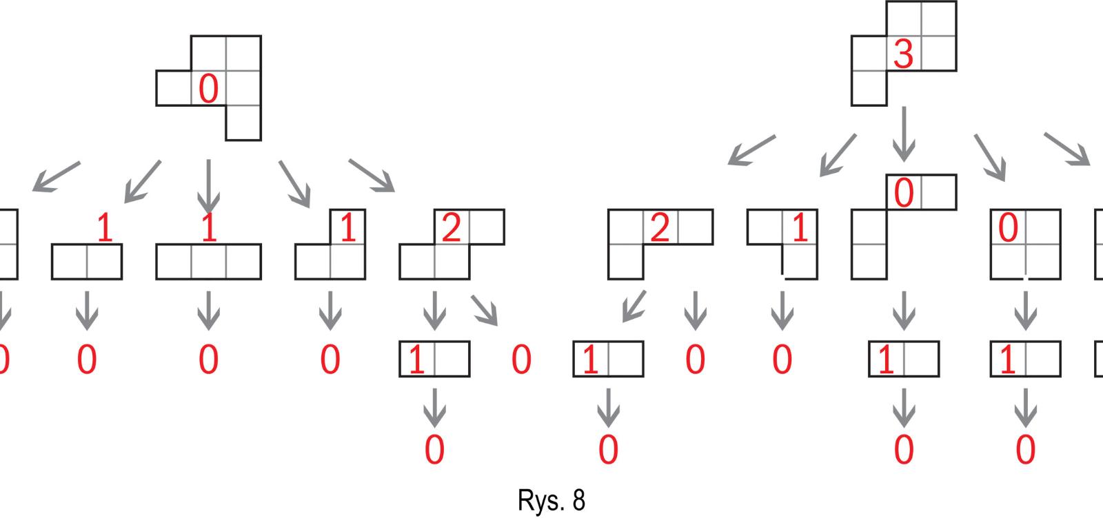 Czym jest nimber w drzewie wykładanki najlepiej wyjaśnić na przykładzie. Na rys. 8 powtórzone są dwie skrajne prawe gałęzie drzewa z rys. 4, ale w układzie poziomym i w uproszczonej formie (bez domin). Na każdym poziomie uwzględniono wszystkie całkiem różne (wskazane strzałkami) puste obszary, które mogą powstać po wykonaniu ruchu, czyli po położeniu domina na większym obszarze, znajdującym się piętro wyżej, od którego wychodzą strzałki. Każda gałąź kończy się zerami. Zerowe zakończenie oznacza zupełny brak obszaru albo obszar, w którym nie można wykonać ruchu, bo brak jest prostokąta na domino – a więc porażkę. Od tych zerowych końcówek zaczyna się wpisywanie w poszczególne obszary, czyli w układy pustych pól – nimberów o określonych wartościach (czerwonych liczb). Zasada wpisywania jest następująca: nimber umieszczany w danym układzie pól jest najmniejszą nieujemną liczbą całkowitą, której nie ma wśród liczb wskazanych strzałkami skierowanymi z danego układu ku układom na niższym poziomie. Jeśli więc z układu wychodzi tylko jedna strzałka wskazująca na zero, to w tym układzie pojawi się nimber 1, jeżeli zaś jest odwrotnie, czyli jedyna strzałka wskazuje na 1, to nimberem będzie zero. Teraz jest jasne, dlaczego w obszarze wyjściowym lewej gałęzi na rys. 8 znajduje się zero, a w prawej gałęzi trójka. A główny wniosek związany z nimberami jest następujący: dodatni nimber oznacza obszar W, natomiast zerowy to obszar P, czyli porażka – oczywiście tego, kto ma w tym obszarze wykonać ruch i przy założeniu, że przeciwnik nie popełni błędu.