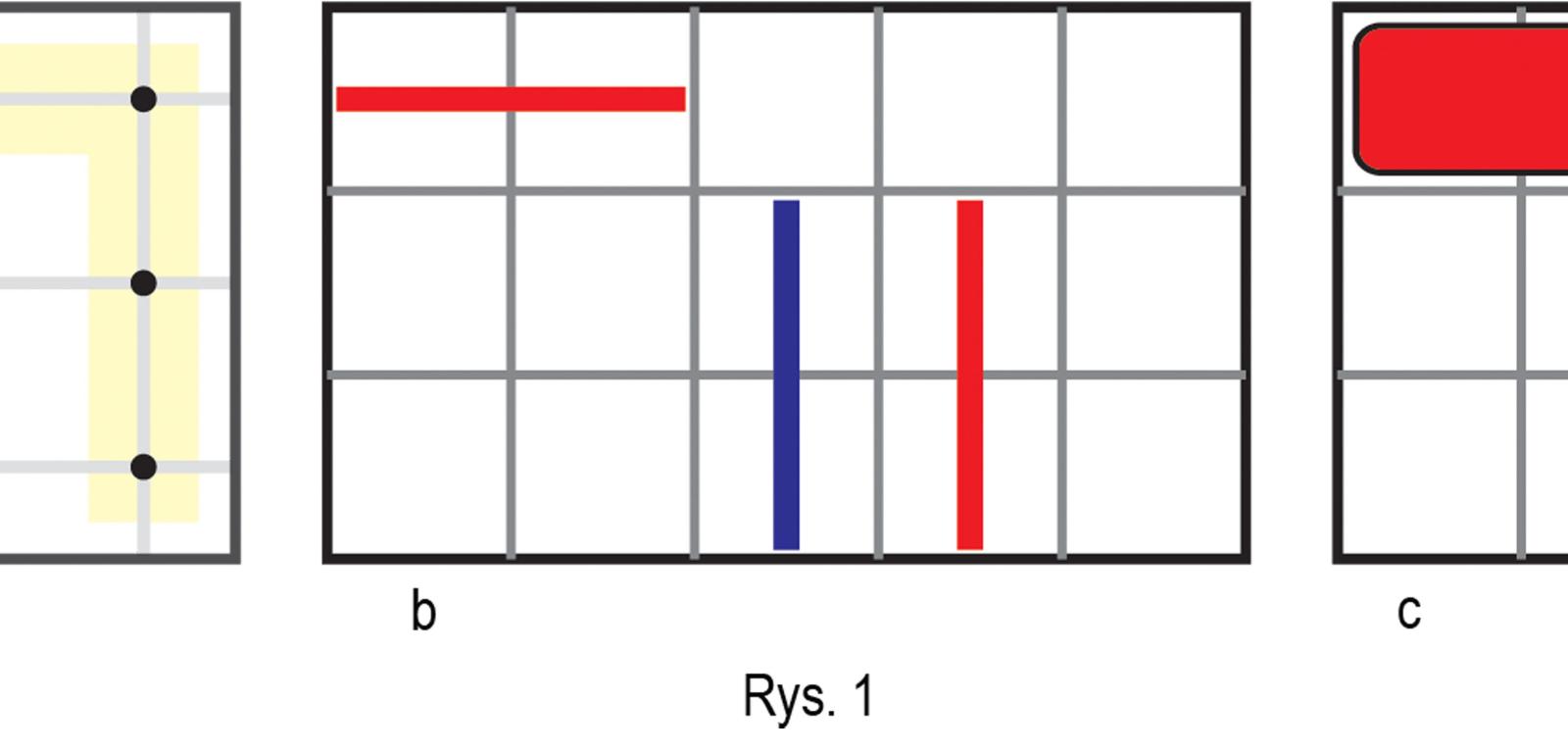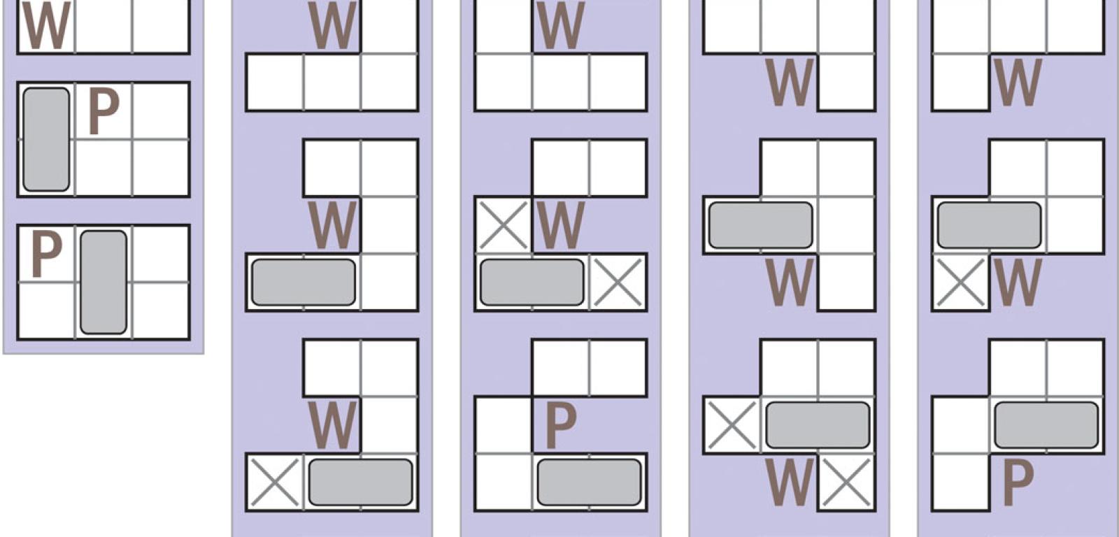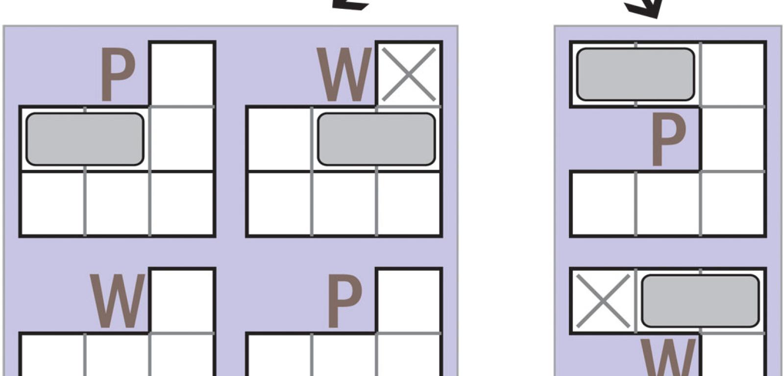 Istotne jest ustalenie, czy dany obszar, złożony na ogół z nie więcej niż 10 kratek, jest wygrywający (W) czy przegrywający (P) dla gracza, na którego przypada ruch. W praktycznej grze kształty takich obszarów są nieregularne, ale gwoli jasności wykorzystamy jako przykład najmniejszą planszę – 3×3. Na rys. 3 znajduje się fragment drzewa gry na takiej planszy, obejmujący wszystkie układy, które mogą się pojawić w trakcie dwóch początkowych ruchów. Po drugim ruchu wolny obszar zmniejsza się do pięciu kratek i wówczas łatwo określić, czy jest on W czy P. Jeżeli wśród możliwych układów po danym ruchu przynajmniej jeden obszar jest P, to znaczy, że przed ruchem obszar na planszy był W. Cofanie się w ten sposób prowadzi do oznaczenia początkowego pustego obszaru odpowiednią literą, czyli w tym przypadku planszy 3×3 literą P.