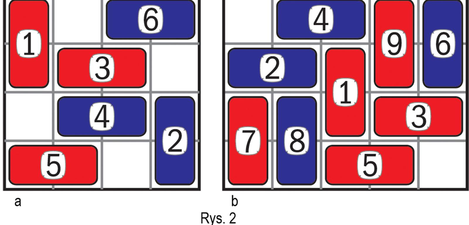 2. Łatwo określić, z ilu ruchów składa się najdłuższa (teoretycznie, bo praktycznie nikt by tak nie grał) partia wykładanki na prostokątnej planszy m×k: mk/2, gdy liczba pól jest parzysta lub (mk–1)/2 przy nieparzystej liczbie pól. Trudniej ustalić najmniejszą możliwą liczbę ruchów, czyli grę do chwili, gdy na planszy pozostaną tylko puste pojedyncze kratki (1×1), a ich liczba będzie największą możliwą. Przykładowa pozycja kończąca najkrótszą, złożoną z 9 ruchów partię na planszy 5×5 przedstawiona jest na rys. 10. Z ilu ruchów składa się najkrótsza partia na standardowej planszy 7×7?