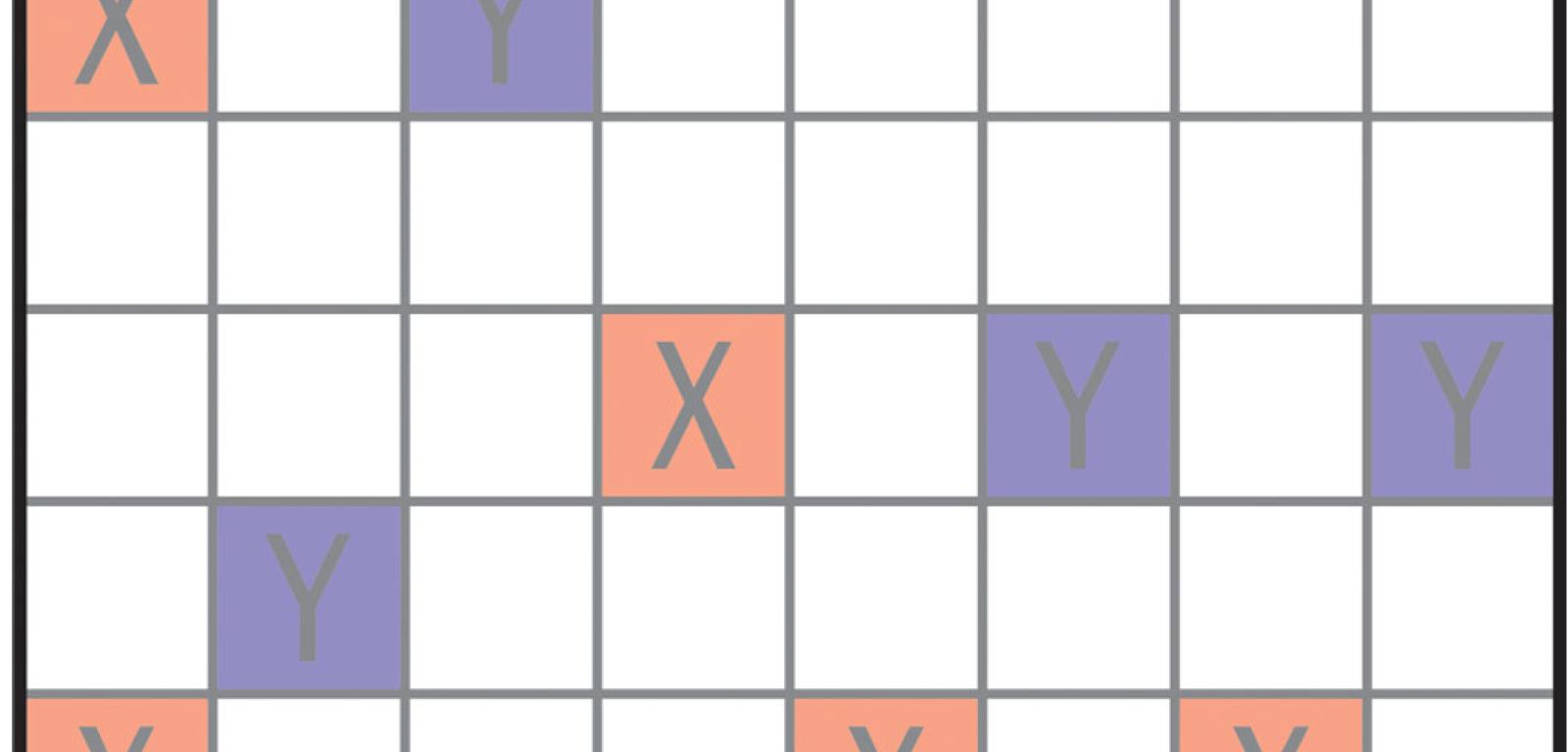 3. Gra w wykładankę na szachownicy 8×8 ma sens przy dodatkowym warunku: nie wolno wykonywać symetrycznych ruchów, czyli kłaść domina symetrycznie względem środka planszy w stosunku do położonego przez przeciwnika w poprzednim ruchu. Rys. 11 przedstawia „niepełną” sytuację w trakcie rozgrywki na takiej planszy. „Niepełną”, ponieważ ujawnione są tylko pola zajmowane przez połówki niektórych (nie wszystkich) domin obu stron – czerwonego (X) i niebieskiego (Y). Zadanie polega na odtworzeniu pełnej pozycji, jeśli wiadomo, że:
