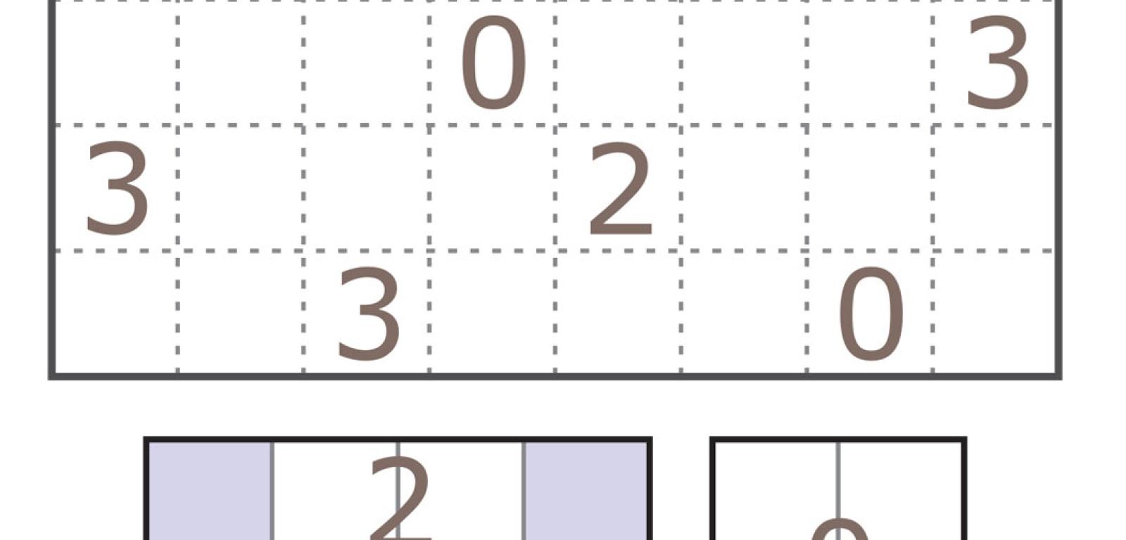 2. Diagram 8×8 podzielono na 16 4-kratkowych części (tetromin), po czym granice między częściami usunięto (rys. 7). Należy odtworzyć podział, korzystając z umieszczonych w diagramie liczb. Każda znajduje się w innym tetrominie i oznacza, ile w tym tetrominie jest „słabych” kratek. Słaba kratka to taka, która wiąże się z tetrominem tylko jednym bokiem. Gwoli jasności na rys. 7 u dołu jest komplet tetromin z oznaczonymi na niebiesko słabymi kratkami. W rozwiązaniu wystarczy podać, ile tetromin ma kształt litery L, uwzględniając także litery obrócone oraz odbite w lustrze.