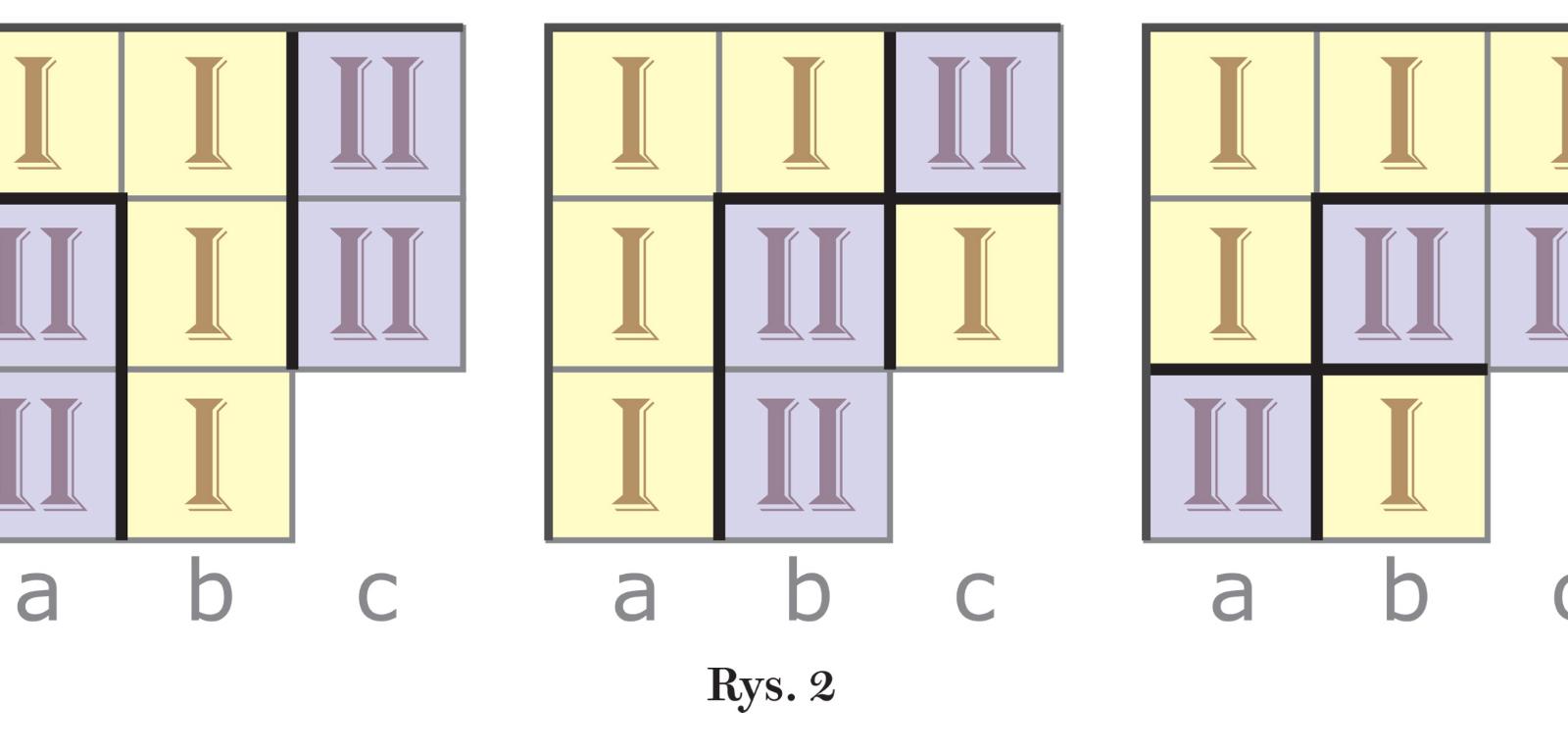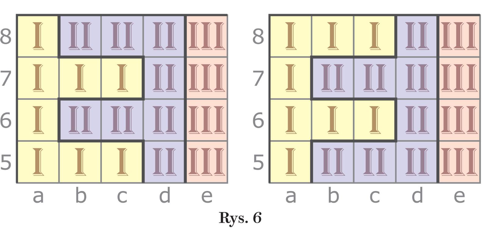 Z odpowiedzi na strzał ab-78 wnioskujemy, że skoro sektory są obszarami spójnymi, to narożne pole a8 nie może należeć do sektora II, bo byłoby otoczone sektorem I, czyli odcięte od reszty diagramu; zatem a8 jest częścią sektora I, zaś w sektorze II znajduje się jedno z pól a7, b7 lub b8. Gdy drugi strzał skierujemy na kwadrat bc-78, a trzeci na ab-67, to w obu przypadkach odpowiedzi będą takie same: I-2, II-2. Stąd efekt trzech początkowych strzałów: pięć możliwych granic między sektorami w lewym górnym rogu (rys. 2). Układy pierwszy i drugi trzeba jednak odrzucić, bo wówczas sektor II otaczałby sektor I, a to niemożliwe, skoro oba liczą tyle samo kratek. Pominąć należy także podziały trzeci i czwarty, ponieważ wtedy wykluczona jest spójność każdego z dwu sektorów. Pozostaje zatem jako właściwy tylko piąty podział. Jeśli teraz uwzględnimy odpowiedź na strzał bc-56 (I-1, II-1, III-1, IV-1 – oznacza to umieszczenie w kwadracie bc-56 granic w postaci krzyża rozdzielającego cztery pola) i zapytamy o kwadrat cd-56 (odpowiedź – III-3, IV-1), to z obu odpowiedzi uda się wywnioskować dalszy podział na sektory, który w sumie po pięciu strzałach obejmie ponad jedną czwartą diagramu (rys. 3). Można więc szacować, że z wszystkich możliwych 49 strzałów około 20 wystarczy, aby rozszyfrować całość. To jednak wariant optymalny, który z punktu widzenia strategii gry nie jest korzystny, bo liczba strzałów powinna być minimalna. I tu pojawia się losowość, która dodaje grze uroku, bowiem wybieranie ostrzeliwanych miejsc, które ma wpływ na efektywność i szybkość rozwiązywania, jest w mniejszym lub większym stopniu przypadkowe. Czy teoretycznie możliwe jest ujawnienie całego podziału w kilku strzałach? W ilu najmniej? I czy zawsze jest możliwe? O tych problemach, związanych ze sposobem podziału, za chwilę. A tymczasem krótko o liczbie różnych podziałów, czyli jakby o liczbie pozycji wyjściowych w grze.