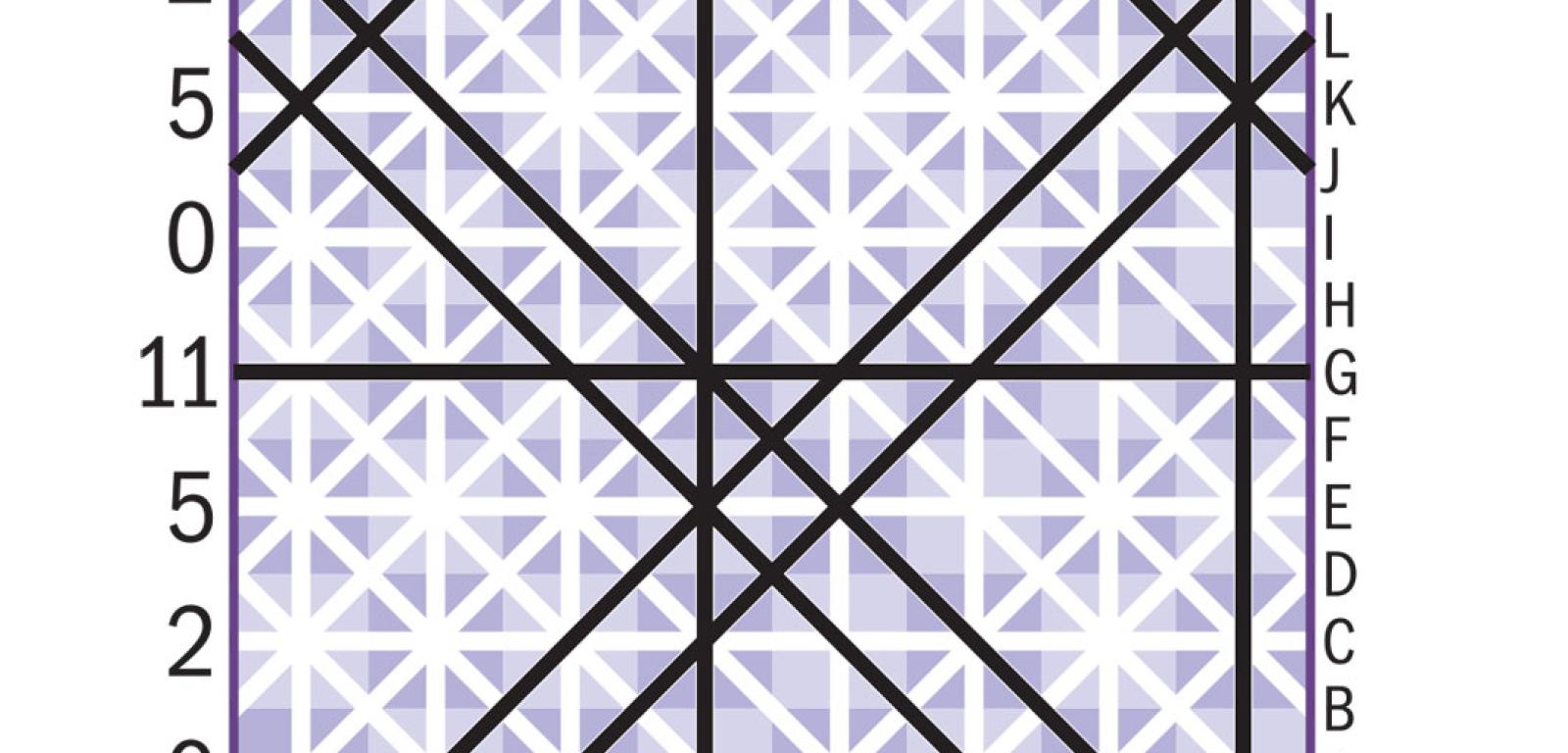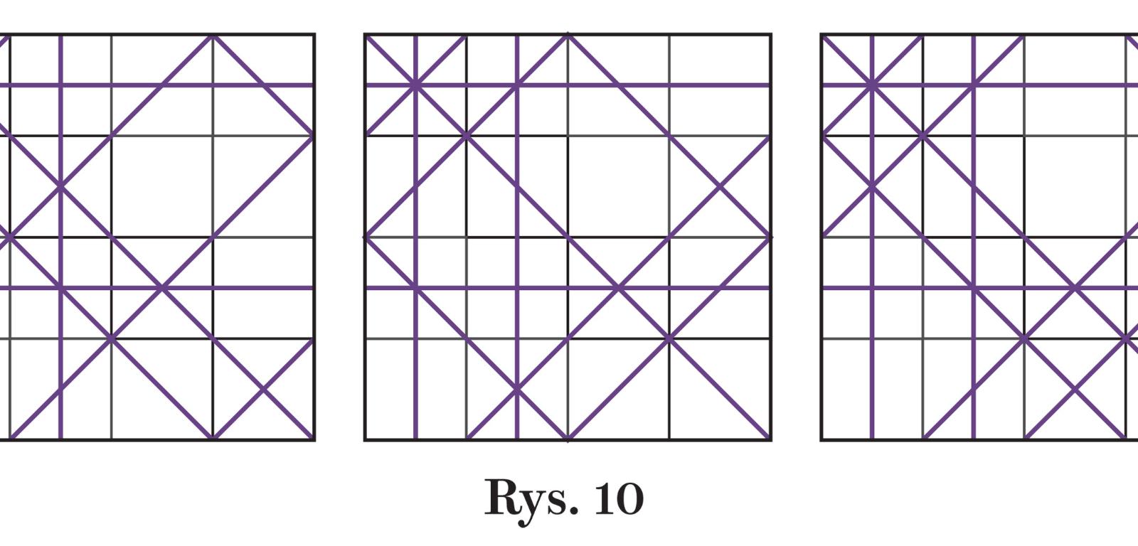 4. W kończącym artykuł zadaniu treningowym należało, podobnie jak w grze, odtworzyć podział na podstawie podanych po strzałach informacji. Tym razem jest odwrotnie, czyli podział znamy (rys. 9), a zadanie polega na znalezieniu trzech i tylko trzech takich strzałów, aby wnioskując z udzielonych na nie odpowiedzi, można było zrekonstruować cały podział.