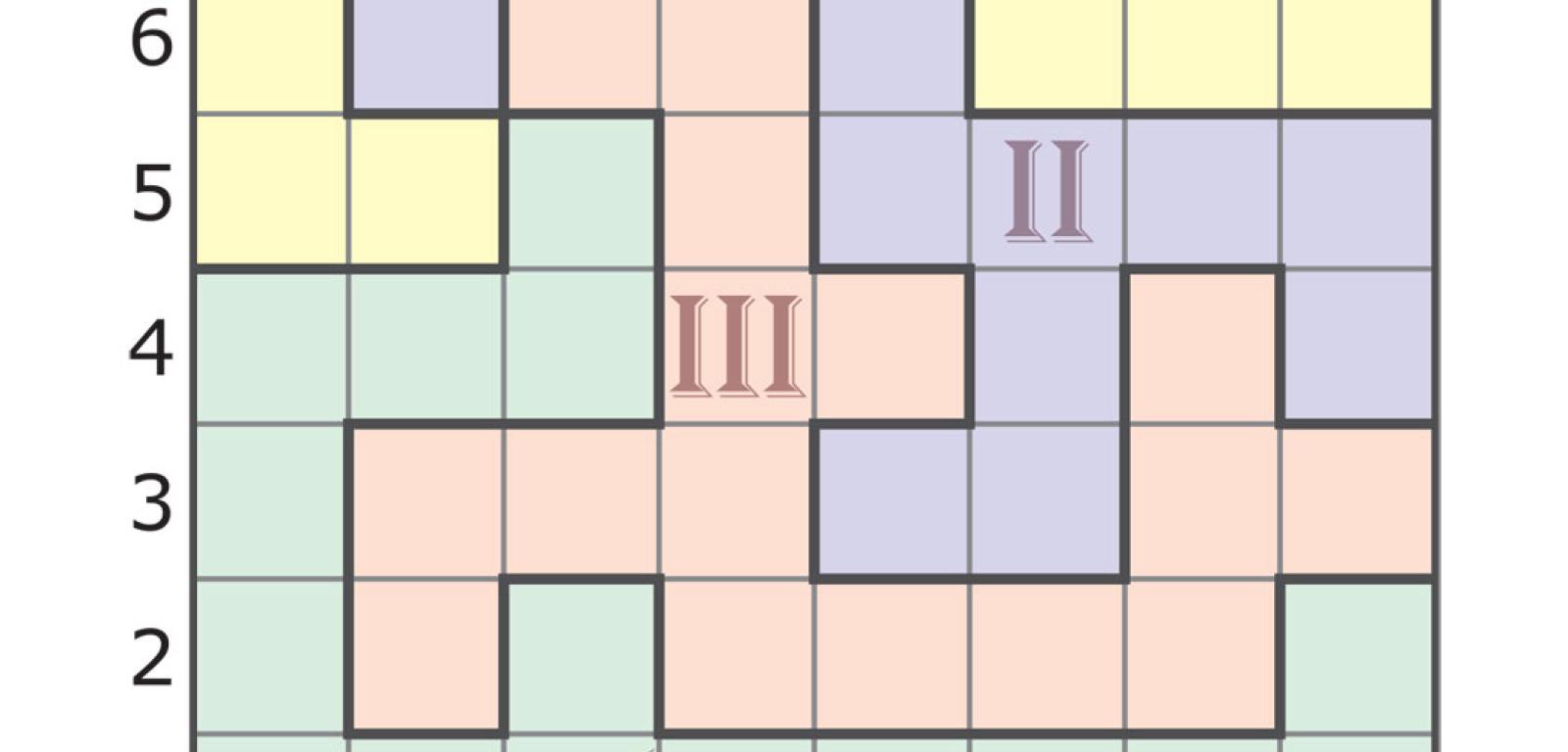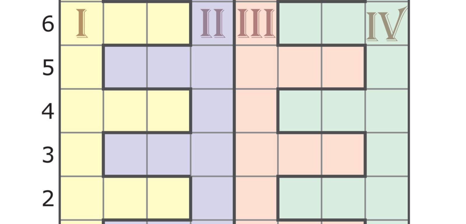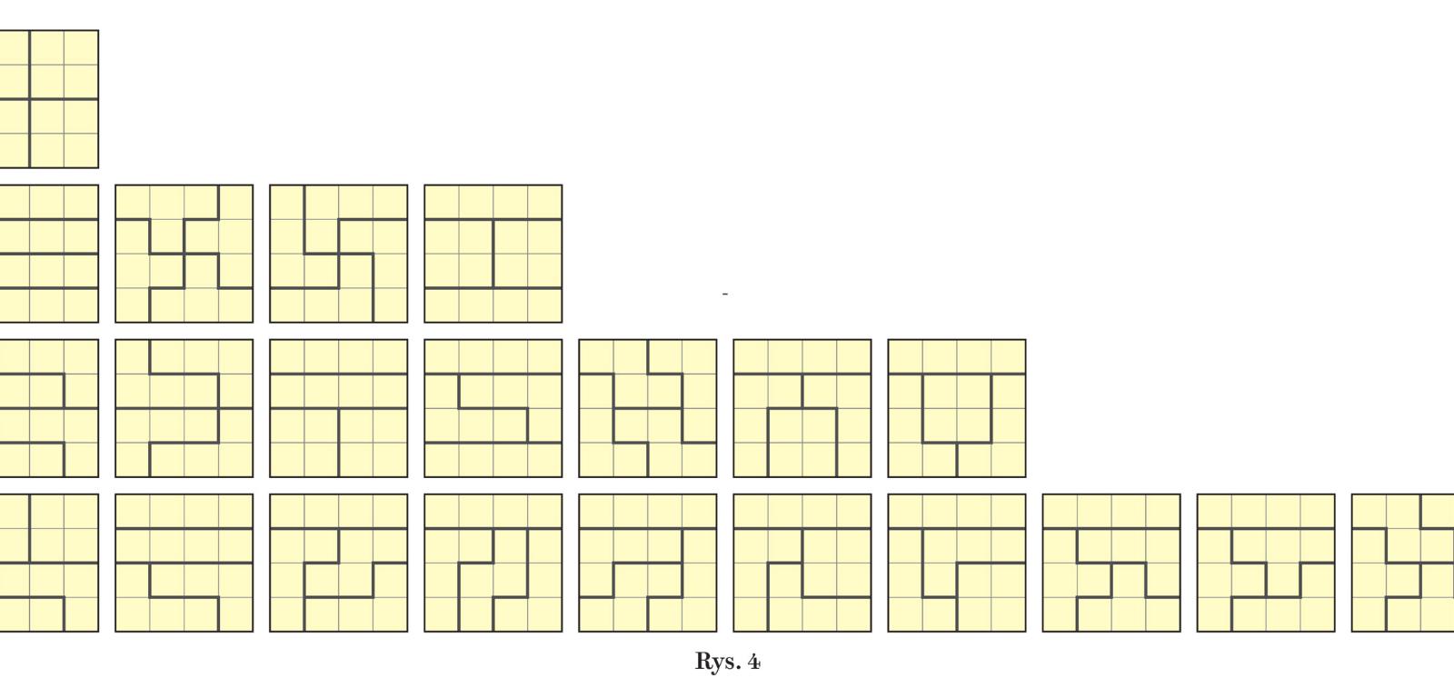 Gdyby zamiast 8×8 pole łamigłówki miało wymiary 2×2, to zabawa oczywiście nie miałaby sensu, bo podział jest tylko jeden. Już jednak przy formacie 4×4 gra nie byłaby trywialna. Całkowicie różne podziały takiego kwadratu na cztery 4-kratkowe sektory są 22 (rys. 4), a jeśli uwzględnić obroty i odbicia lustrzane – mnożąc liczby podziałów w drugim, trzecim i czwartym wierszu na rys. 4 odpowiednio przez 2, 4 i 8 – to liczba ta wzrośnie do 117. W następnym większym diagramie, czyli 6×6, po podziale na cztery sektory każdy z nich składałby się z 9 kratek, zaś liczba podziałów wyniosłaby blisko 210 tys. W przypadku LAP-u dotąd nikt nie policzył, ile jest podziałów. Wiemy natomiast (komputery uporały się z tym przy okazji analizowania odmiany sudoku zwanej nieregularną), że gdyby diagram 8×8 dzielić nie na cztery sektory 16-kratkowe, a na osiem 8-kratkowych, to różnych podziałów byłoby prawie 190 mld. Można przypuszczać, że dla LAP-u liczba ta jest mniej więcej dwukrotnie mniejsza, czyli i tak astronomiczna.