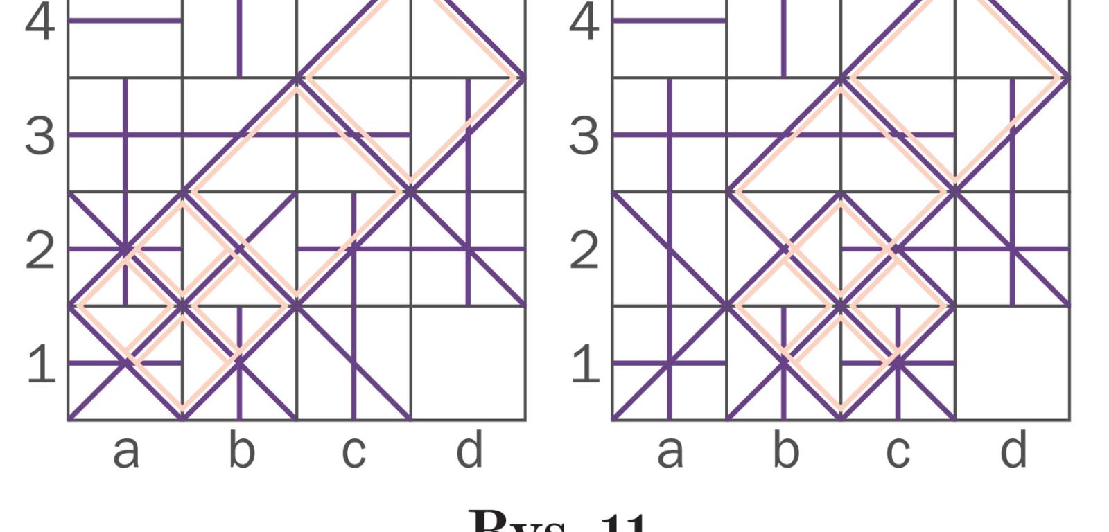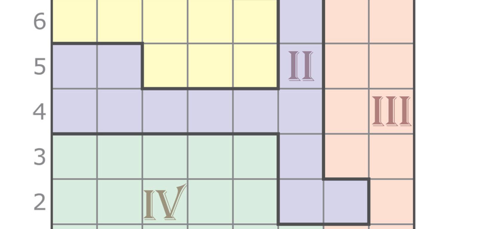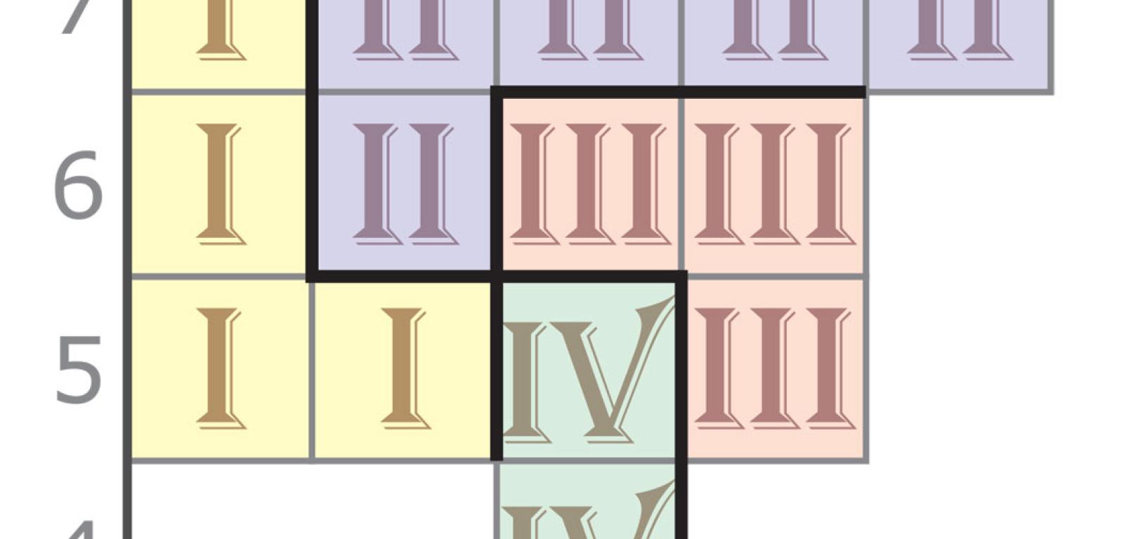 Gdyby zamiast 8×8 pole łamigłówki miało wymiary 2×2, to zabawa oczywiście nie miałaby sensu, bo podział jest tylko jeden. Już jednak przy formacie 4×4 gra nie byłaby trywialna. Całkowicie różne podziały takiego kwadratu na cztery 4-kratkowe sektory są 22 (rys. 4), a jeśli uwzględnić obroty i odbicia lustrzane – mnożąc liczby podziałów w drugim, trzecim i czwartym wierszu na rys. 4 odpowiednio przez 2, 4 i 8 – to liczba ta wzrośnie do 117. W następnym większym diagramie, czyli 6×6, po podziale na cztery sektory każdy z nich składałby się z 9 kratek, zaś liczba podziałów wyniosłaby blisko 210 tys. W przypadku LAP-u dotąd nikt nie policzył, ile jest podziałów. Wiemy natomiast (komputery uporały się z tym przy okazji analizowania odmiany sudoku zwanej nieregularną), że gdyby diagram 8×8 dzielić nie na cztery sektory 16-kratkowe, a na osiem 8-kratkowych, to różnych podziałów byłoby prawie 190 mld. Można przypuszczać, że dla LAP-u liczba ta jest mniej więcej dwukrotnie mniejsza, czyli i tak astronomiczna.