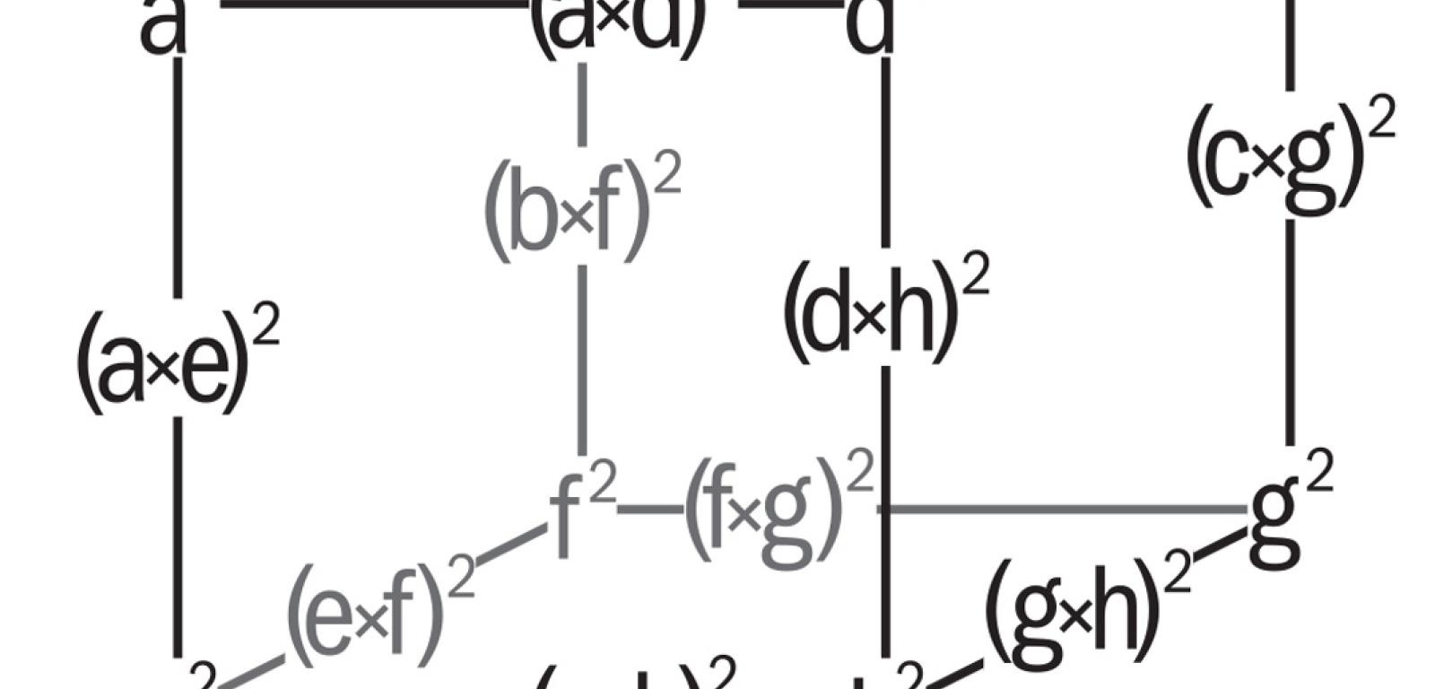 2. W ośmiu wierzchołkach sześcianu rozmieszczono kwadraty różnych liczb, a przy każdej z 12 krawędzi wpisano iloczyn liczb na jej końcach (rys. 1). Gdyby w wierzchołkach znalazły się wszystkie liczby od 1 do 9 – oprócz 8 – i gdyby ich rozmieszczenie było takie, jak na rys. 2, to wszystkie 12 iloczynów oraz ich suma tworzyłyby „okrągłą” pitagorejską… trzynastkę:
