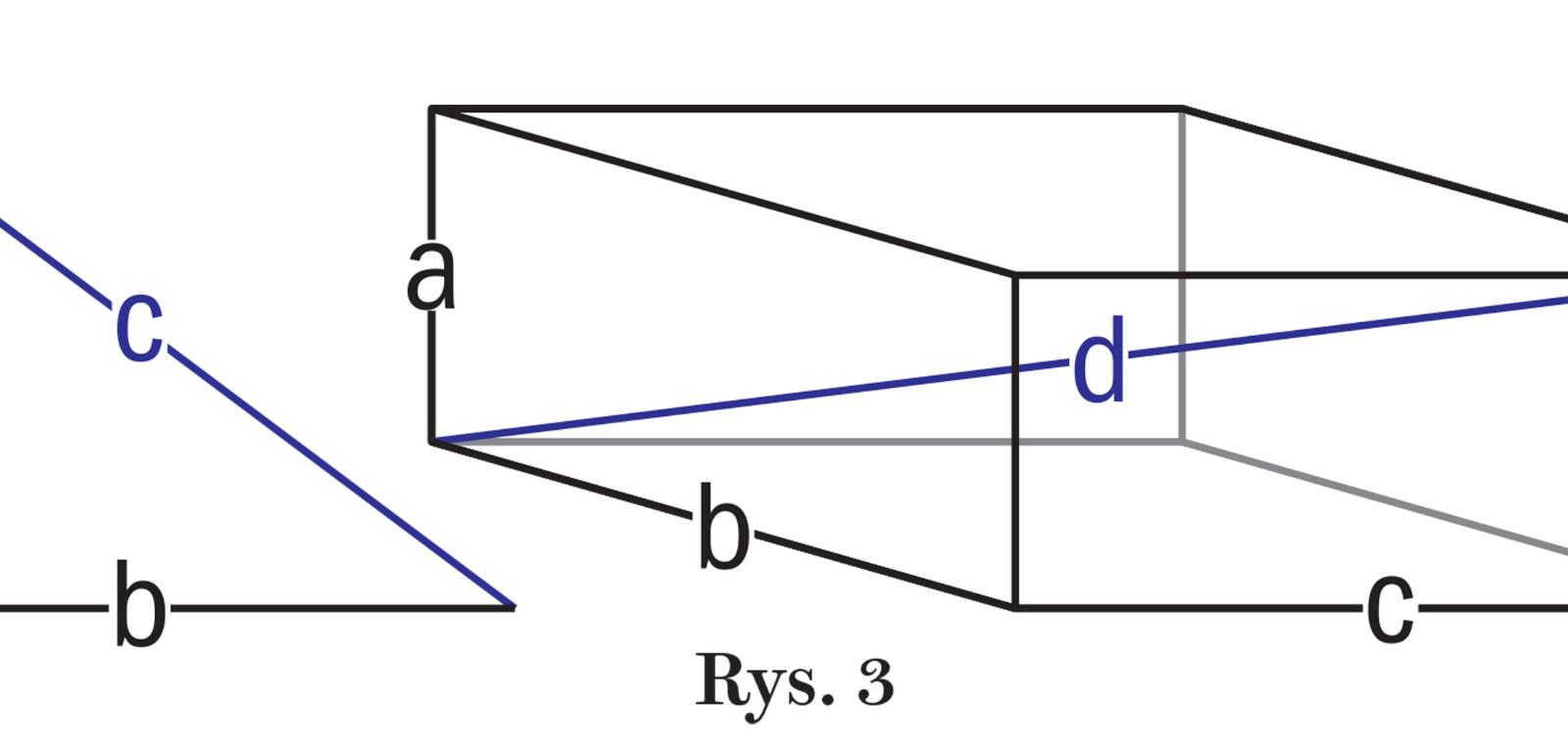 4. Obrazem geometrycznym trójki pitagorejskiej (a, b, c) jest trójkąt prostokątny o przyprostokątnych (a, b) i przeciwprostokątnej c. Obrazem czwórki pitagorejskiej (a, b, c, d) jest prostopadłościan o krawędziach (a, b, c) i przekątnej d (rys. 3). Co jest (może być) interpretacją geometryczną piątki pitagorejskiej (a, b, c, d, e)?