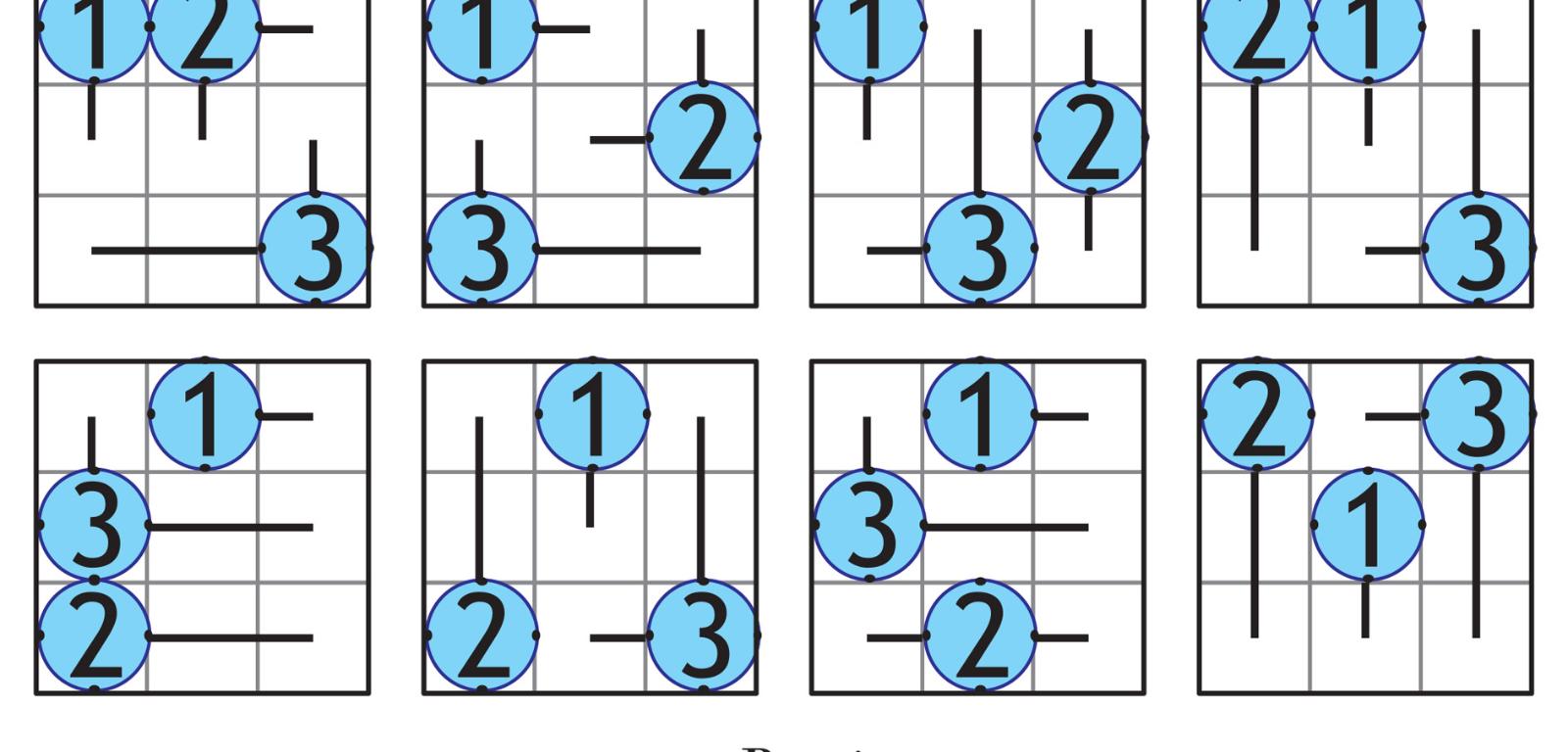 Zwane jest od XVIII wieku równaniem Pella-Fermata albo tylko Pella, jeśli b=1. Jedno rozwiązanie równania 9+8n2=x2 łatwo znaleźć, podstawiając pod n kolejne liczby dotąd, aż po lewej stronie pojawi się kwadrat. Właściwie już pierwsze podstawienie owocuje „niepraktyczną” parą (n, x) = (0, 3), ale wkrótce pojawia się praktyczna (3, 9), co daje k=3. Ta wartość przekłada się na macki z trzema kolikami (1, 2, 3) rozmieszczonymi w kwadracie 3×3 – ich różnych układów (z dokładnością do obrotów i odbić lustrzanych) z jednym rozwiązaniem jest dziesięć. Jak szybko uda się Państwu znaleźć dwa, których brakuje na rys. 4? Szukanie kolejnych par (n, x) lepiej powierzyć komputerowi, choć do następnej nie jest zbyt daleko (18, 51), ale potem dystanse stają się coraz większe: …, (105, 297), (612, 1731), (3567, 10089), (20790, 58803), …